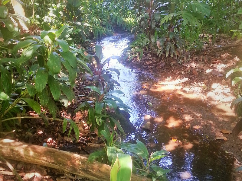 Property is 2.5 acres with a nice forested feel, a beautiful slow moving creek stocked with over 2 lb tilapia, and walkways leading down to the rivers edge.