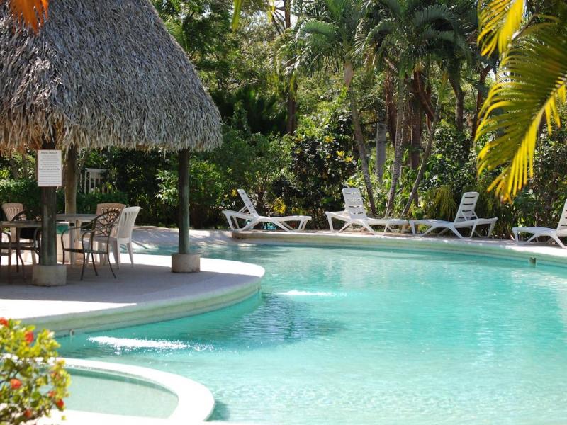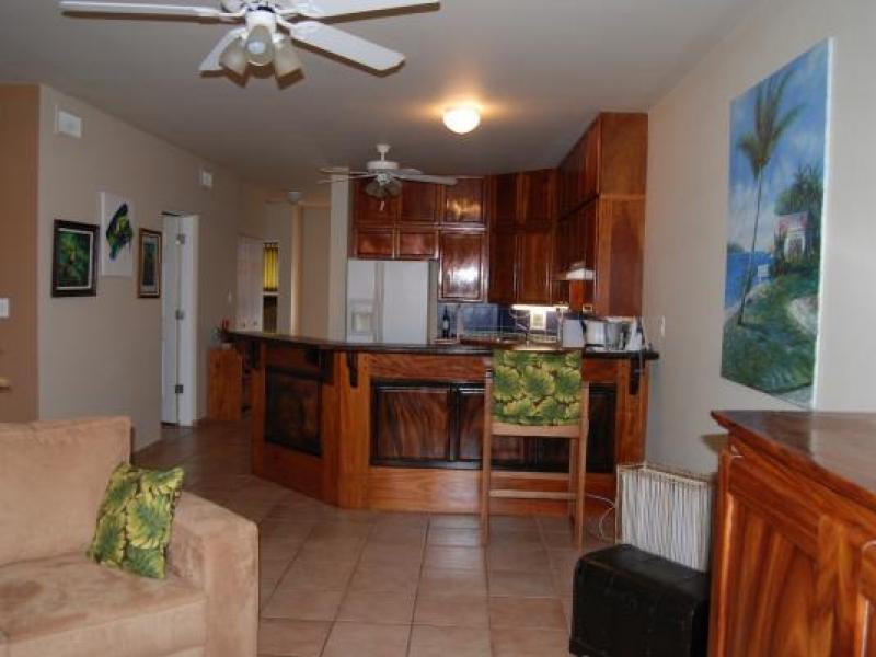 This inviting unit offers central air conditioning and has an easy open floor plan that is ideal for gatherings of family or friends. The comfortably decorated living and dining room area is bright and airy with large windows to take in the surroundings. This space is open to the kitchen, with rich hardwood cabinetry and vibrant tile counters. The master bedroom has a king bed, and there are two double beds in the second bedroom, both with built-in closets. There is the convenience of two full baths and a lovely balcony offers outdoor living space overlooking the pool and a verdant green belt.