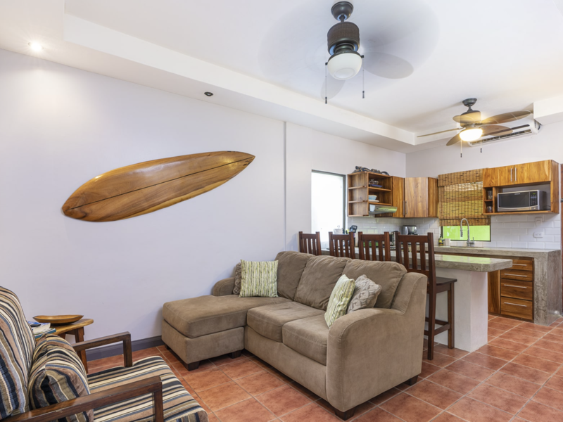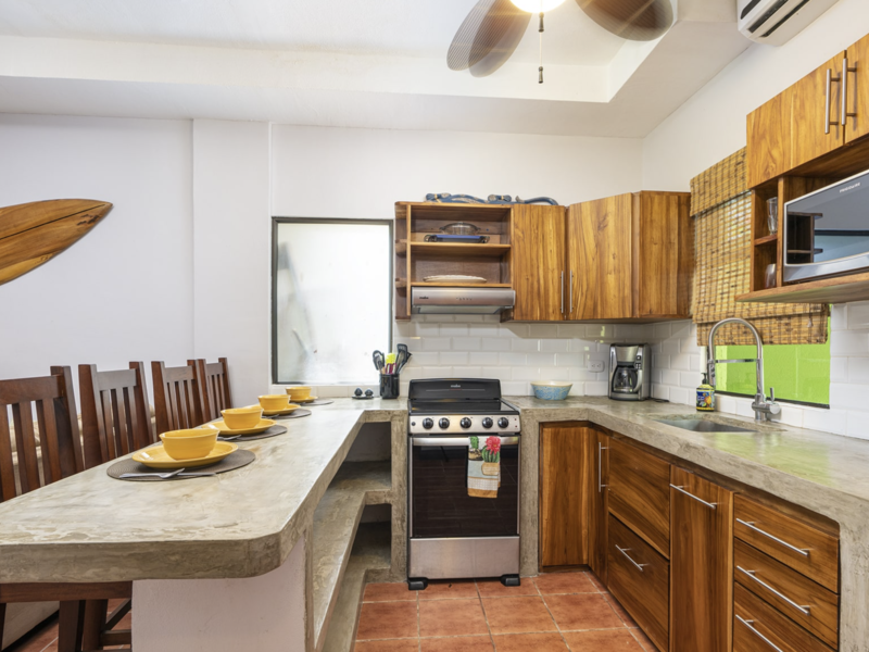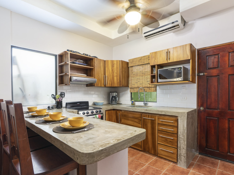 As you enter you are drawn into the open spacious kitchen to living area. Comfortably furnished with fitted wooden cabinets, air conditioning and breakfast bar. The worktops and breakfast bar ae made from polished concrete resulting in durability and a great look. There is room one of side to install a small dining table or work desk. To the back there is an outside utility area which can be used for storage.