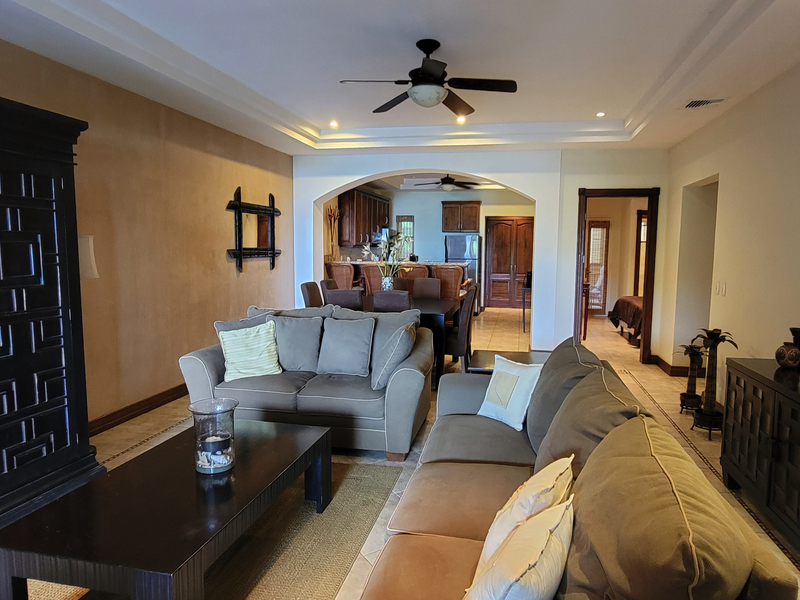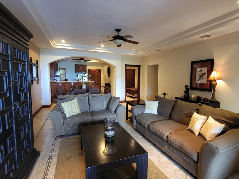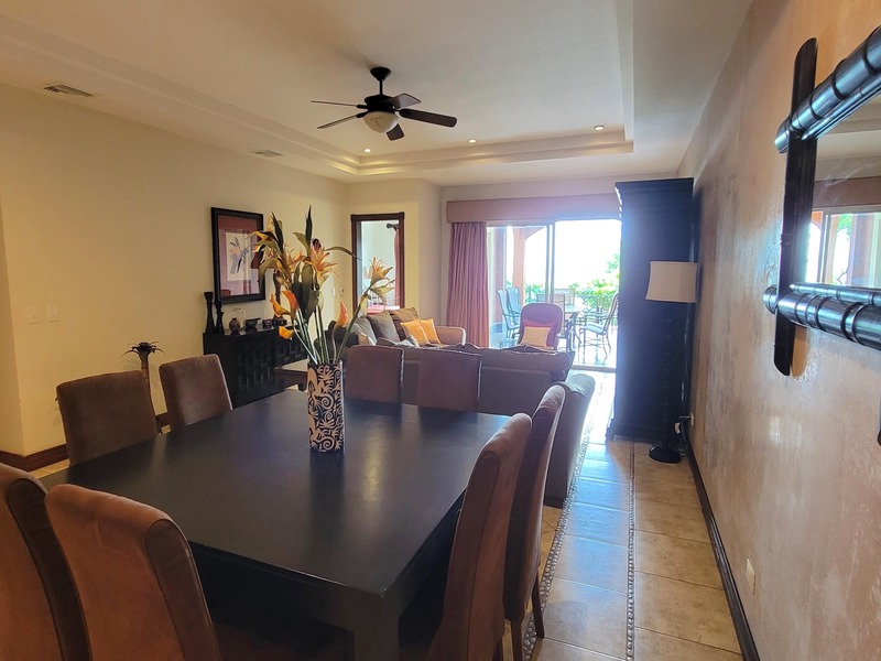 This 2 bed 2 bath condo is spread over 1500ft2 on one level. As you walk into this wonderful living space you are greeted by the kitchen and living area. The kitchen is very well equipped with high end stainless steel appliances, a dishwasher, full sized oven, double sink, granite work tops and hard wood cabinetry. The living area is spacious and houses a 6 person dining table before comfortably fitting a 2 and 3 piece sofa set. The living area leads to the main balcony where there is an additional 4 seater table and chairs and a wonderful ocean view over the Pacific.