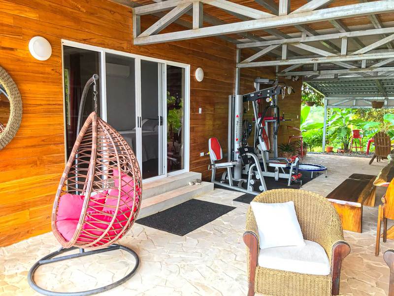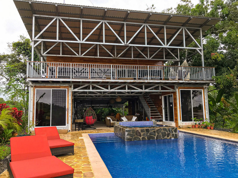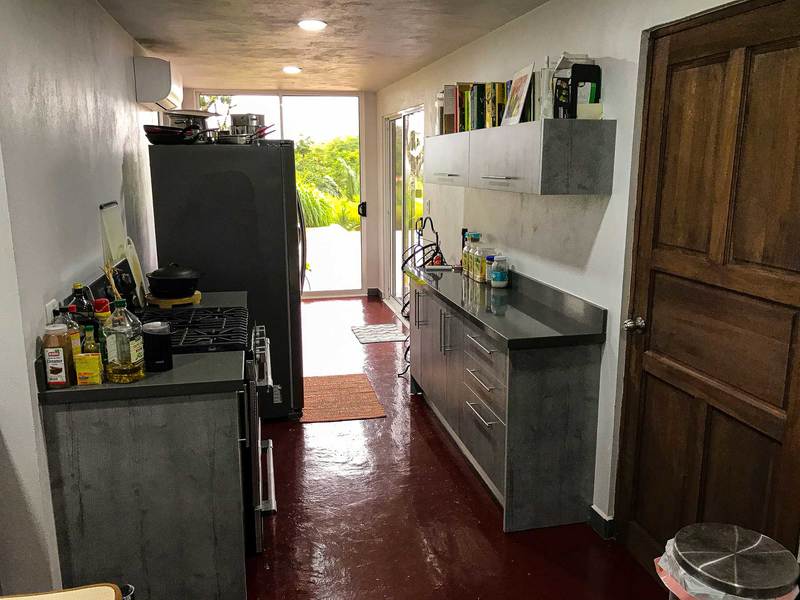 Wake to the sounds of the rain forest as you sip your morning beverage overlooking the beautiful Pacific coastline with a view from Playa Bandera all the way to the hilly shores of Manuel Antonio National Park. This recently updated tropical oasis pool home is designed to fill your senses with the beauty and bounty of nature with very little ecological impact, as it comes with solar power, a saltwater pool and a first level constructed from two shipping containers. On that first floor to one side is a beautiful air-conditioned fully furnished guest suite with a full bath featuring beautiful decorative stonework. And on the other side is a full chef's kitchen with custom-built cabinets, 5 burner gas stove and oven, pantry and indoor dining. In between, there is a large covered breezeway with work-out gym, living area, and dining area to enjoy the tropical breezes and stunning beauty of nature all around. Also downstairs in the back sits your $40,000 fully solar power hybrid system that both feeds into the municipal electrical grid with battery backup too. And there is also a large laundry room with full-size washer and dryer.