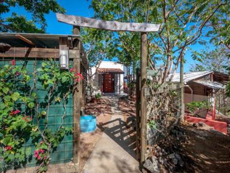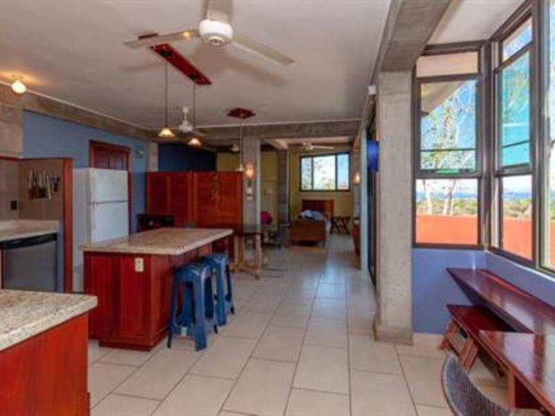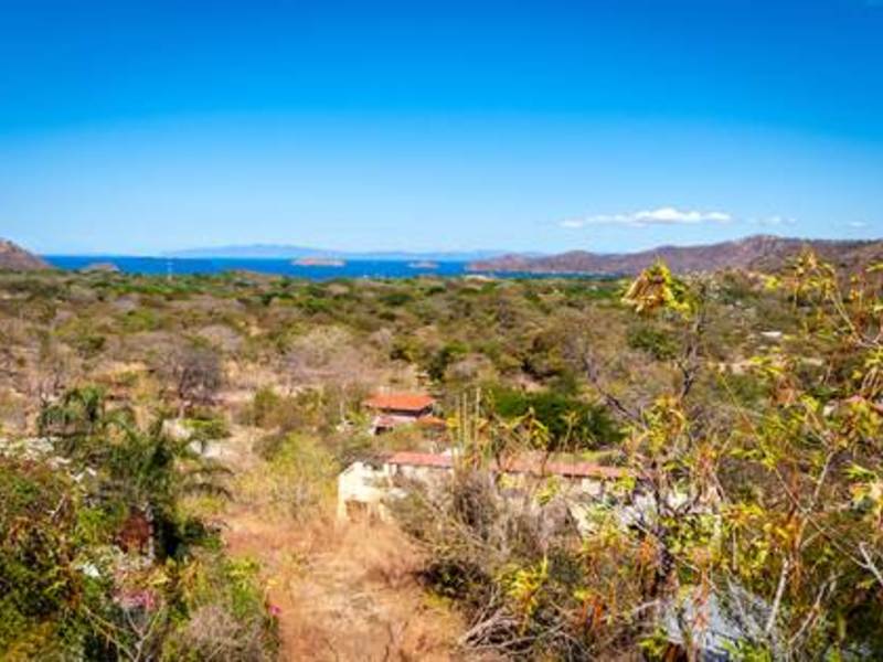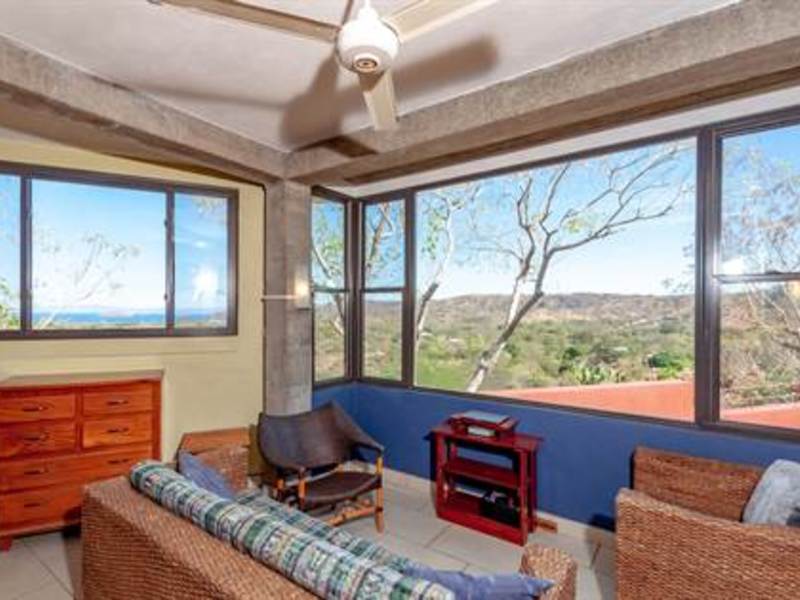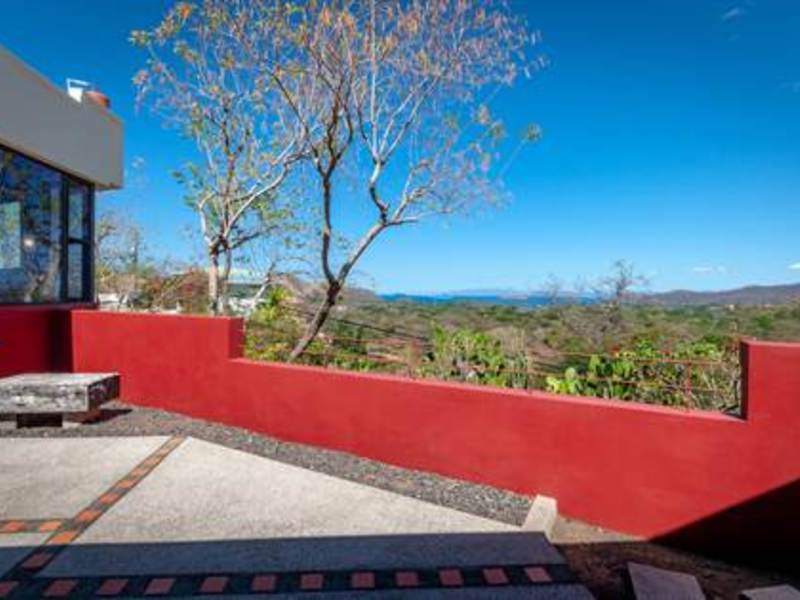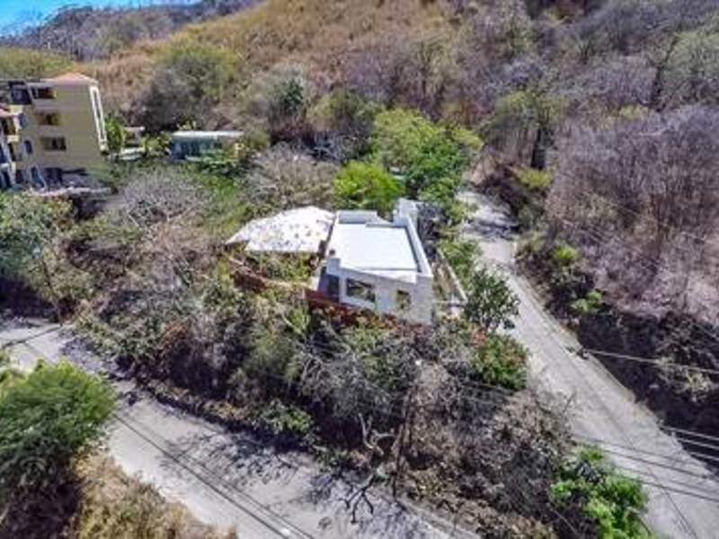 Stunning view from beautiful modern ocean view home overlooking the valleys and beach of the vibrant town of Playas del Coco in Guanacaste, Costa Rica. This modest eclectic house (75m2 = 807 ft2), guest cabin (49m2 = 527 ft2), garage/workshop (36m2 = 388 ft2) and gardens capture simple, affordable living in the tropics. This is a unique property and the discerning person will find it an opportunity as an affordable tropical investment. The property measures 1,276 m2 (1/3 acre) and features a single floor plan main house with expansion possibilities by adding a second floor (75 m2) which is currently being used as a sunset terrace.