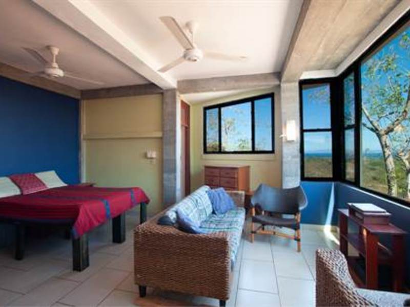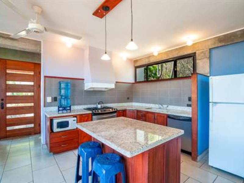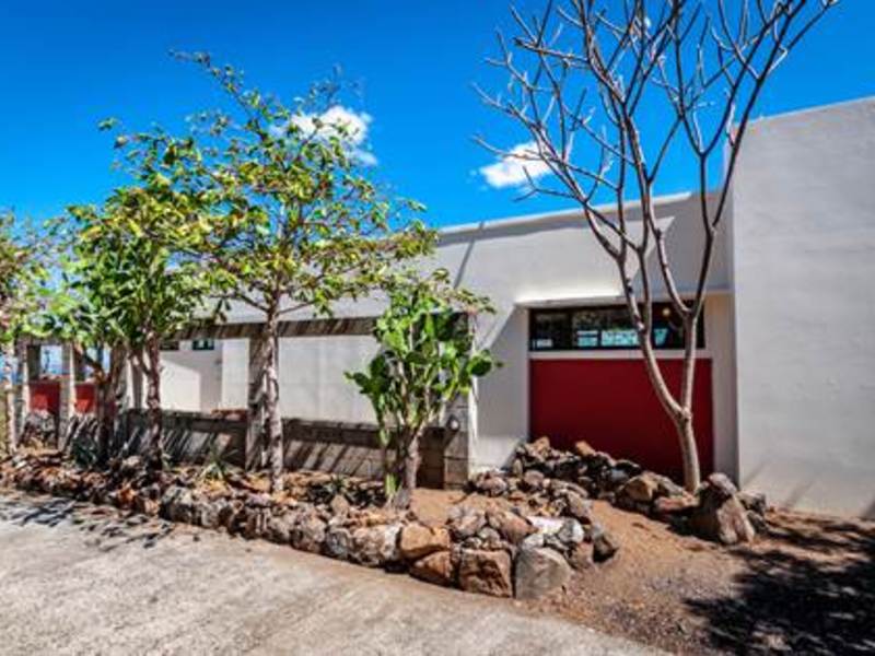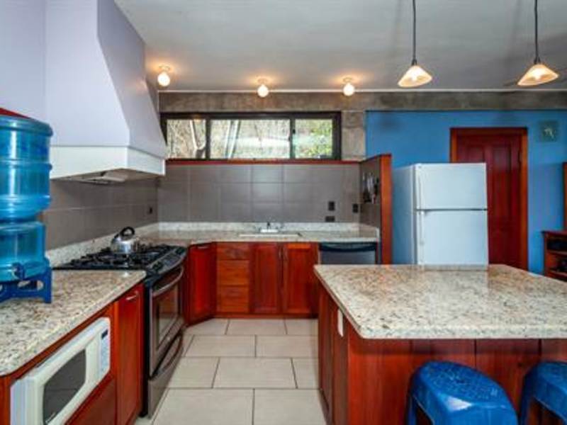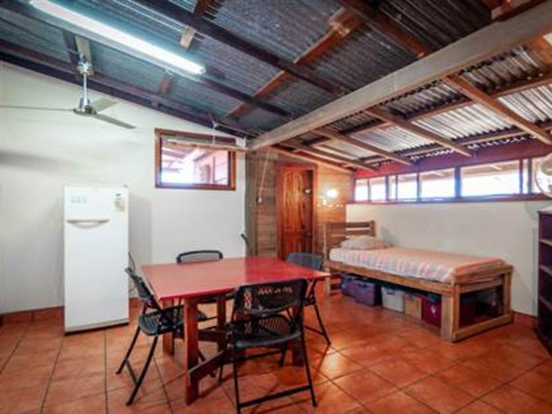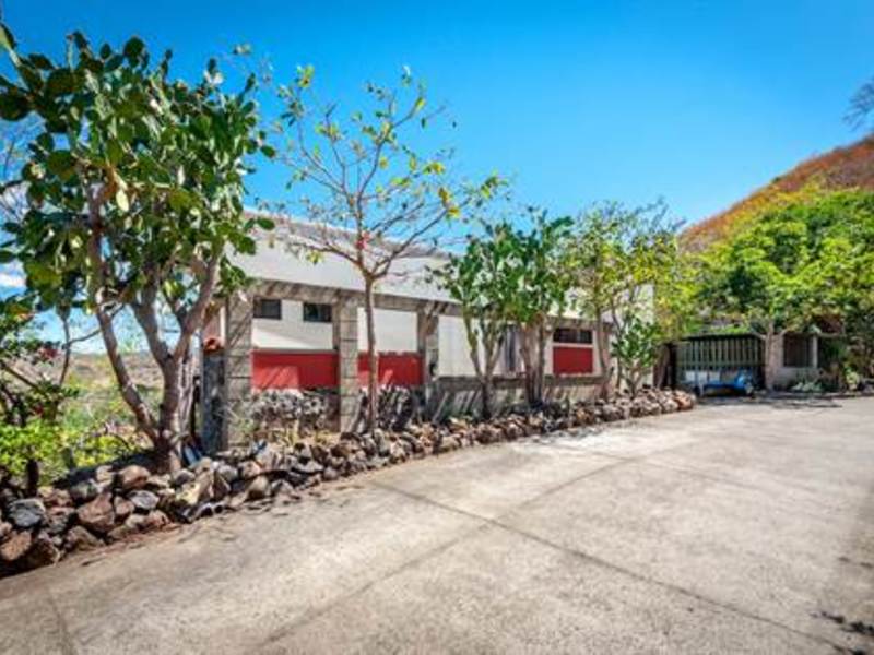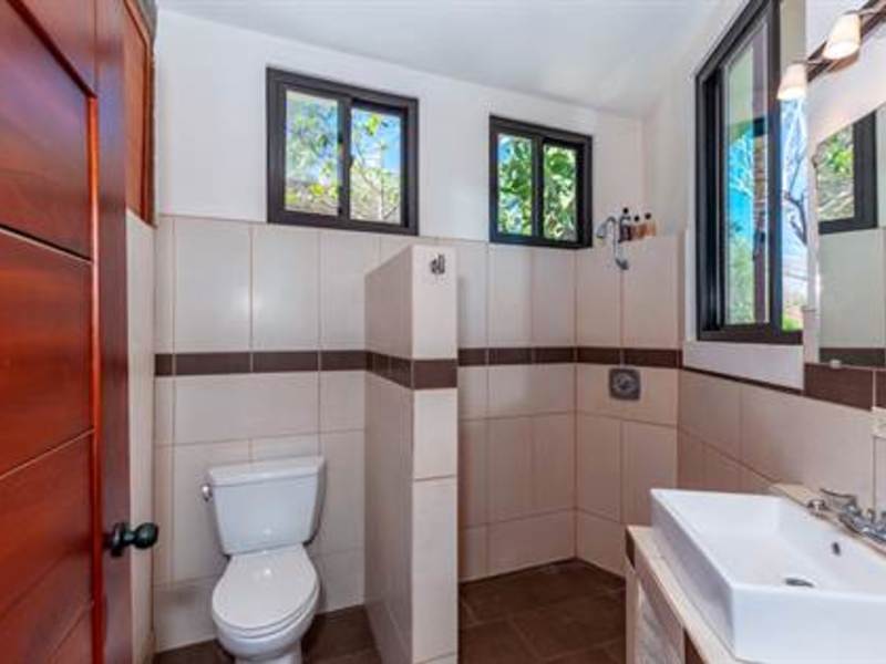 Stunning view from beautiful modern ocean view home overlooking the valleys and beach of the vibrant town of Playas del Coco in Guanacaste, Costa Rica. This modest eclectic house (75m2 = 807 ft2), guest cabin (49m2 = 527 ft2), garage/workshop (36m2 = 388 ft2) and gardens capture simple, affordable living in the tropics. This is a unique property and the discerning person will find it an opportunity as an affordable tropical investment. The property measures 1,276 m2 (1/3 acre) and features a single floor plan main house with expansion possibilities by adding a second floor (75 m2) which is currently being used as a sunset terrace.