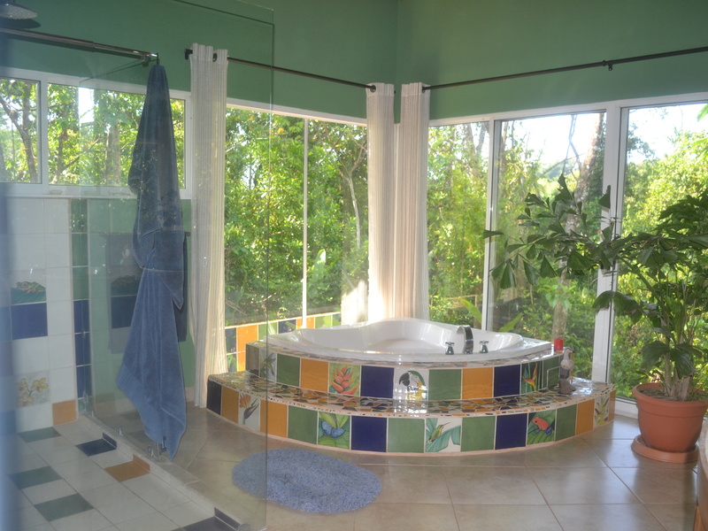 The main bedroom is off the great room and has 2 private entrances and resembles its own apartment with a big balcony, a large walk-in closet and a bathroom that is one of a kind. Big windows looking into the jungle with a large jacuzzi tub and a and dual rainfall shower. The second bedroom is on the bottom floor and could easily be divided into 2 or 3 oversized bedrooms.