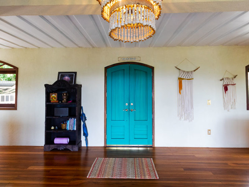 To your left is a living room and to your right is a spacious kitchen complete with ample storage space, a large copper sink, stained wood countertops, and a marble island with a built-in 6 burner stove on one side and a bar top on the other. This kitchen set up is perfect for those who enjoy prepping and cooking while entertaining guests. There is also a UV reverse-osmosis water filtration built into the sink, although the ASADA community water is very good, you can rest assured that you are getting optimum drinking water.