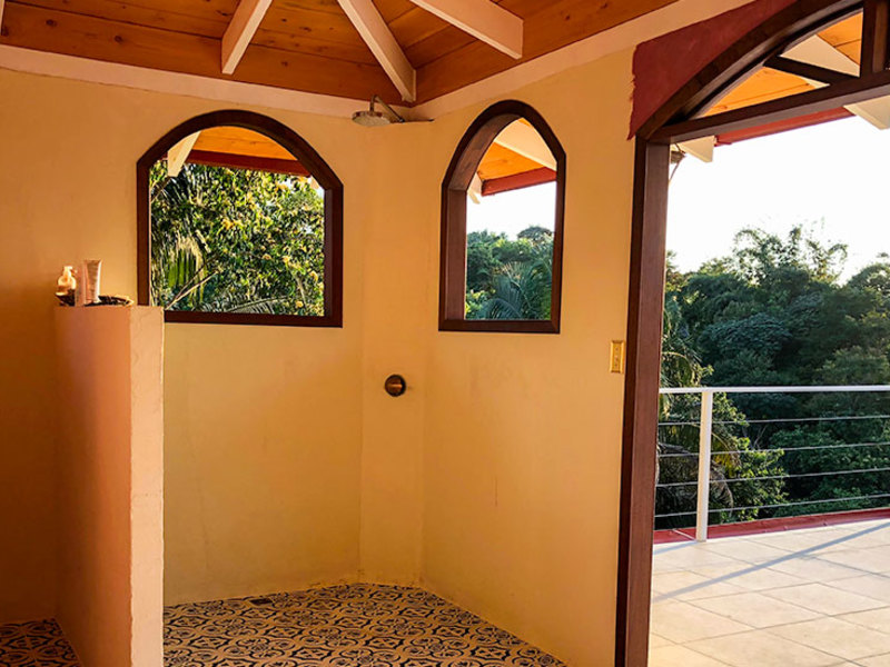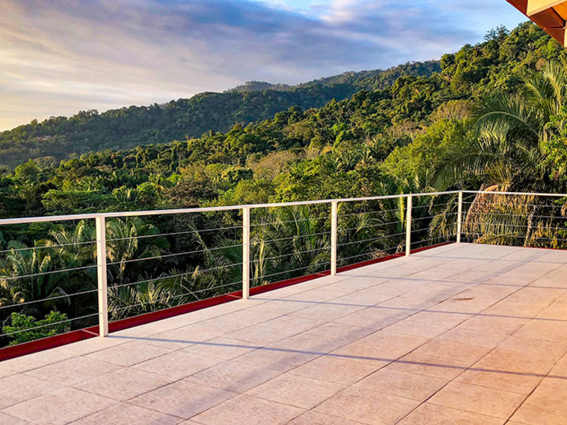 Casa Vista Hermosa was originally a shipping container and has been modified into a beautiful two-story home equipped with 2 bedrooms, a guest house, warm wood floors, ceiling fans, air conditioning, and an open floor plan perfect for anyone looking to create a custom space. If you feel you need another bedroom, the spacious living room can easily be divided into another living space with each having a deck entrance. As you enter the home and survey the space you will notice large glass panel doors that open to reveal a large deck that looks directly out over the jungle to the ocean.