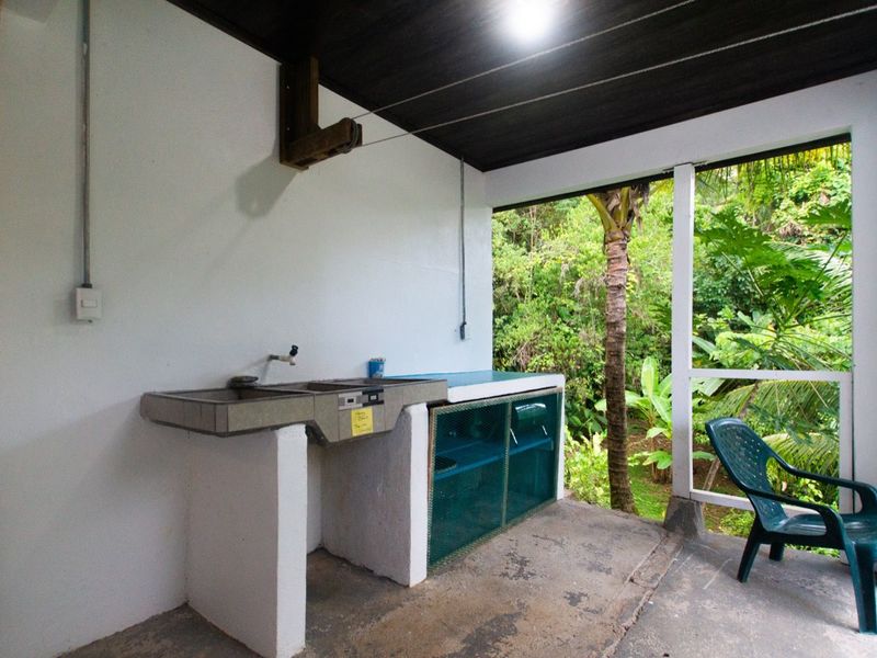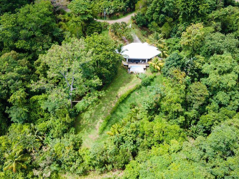 Enter the 3-acre property from a quiet road in a low population neighborhood that is lush with old-growth jungle. The sizable lot is fully landscaped with a thick, natural fence that provides great privacy. The paved driveway leads down to a spacious parking area at the entrance to the home.