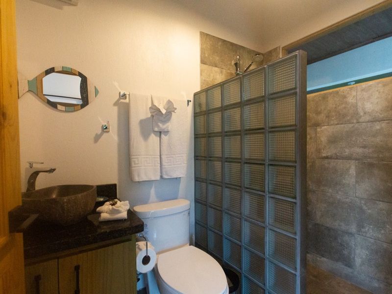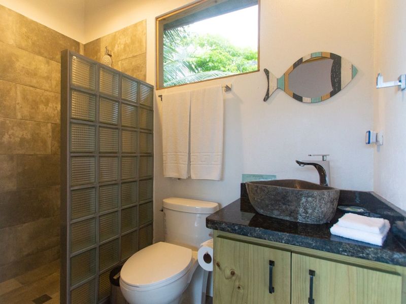The master bedroom is well-sized for comfort and equipped with a lovely bathroom. But it’s the stand out coastal views that you can see from bed that make this home a star! Anyone would feel blessed to wake up to these epic views with the green jungle being framed by a bright bright blue sky and azure ocean.