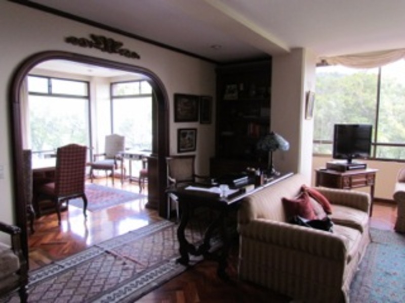 Apartamento cerca al Country Club para la renta con Magnifica vista a la ciudad:El apartamento se encuentra en un condominio de tipo vertical, el cual cuenta con una grandiosa vista de 360 grados a toda la ciudad, en una de las más exclusivas zonas del país, como lo es Escazu. Tiene pisos de madera en la sala, el comedor, la oficina y los dos dormitorios. Los dormitorios tienen cada uno su baño privado y la habitación principal tiene ademas su walk-in closet. También tiene área de lavandería y dormitorio de servicio con baño. El apartamento cuenta con dos parqueos y una bodega. Las áreas sociales tienen una piscina una casa club, hermosos jardines y areas verdes y parqueos para visitas. Adicionalmente, el edificio tiene escalera de emergencias, ascensor de servicio, planta de tratamiento e intercomunicador para el conserje y los guardas que están allí 24/7.