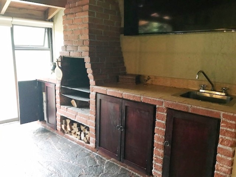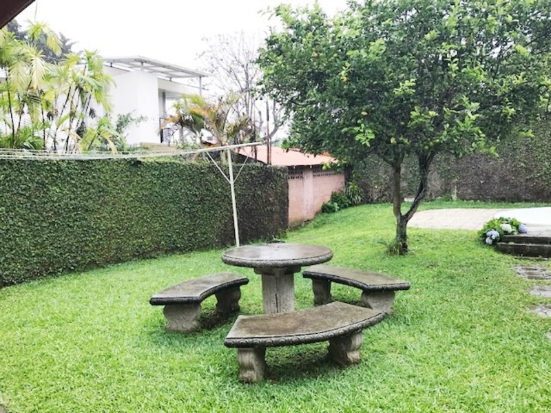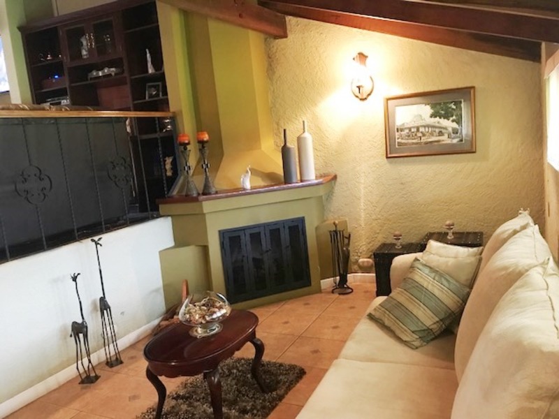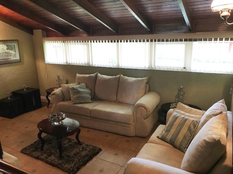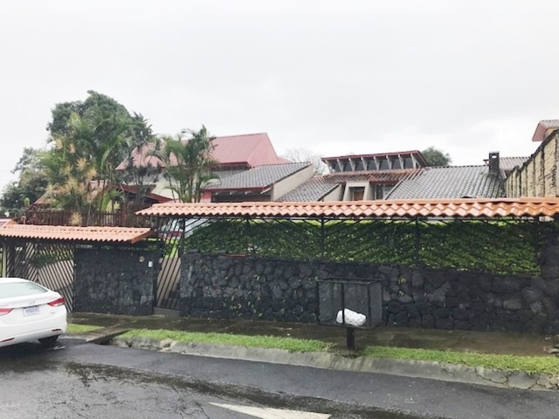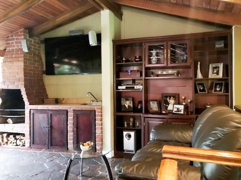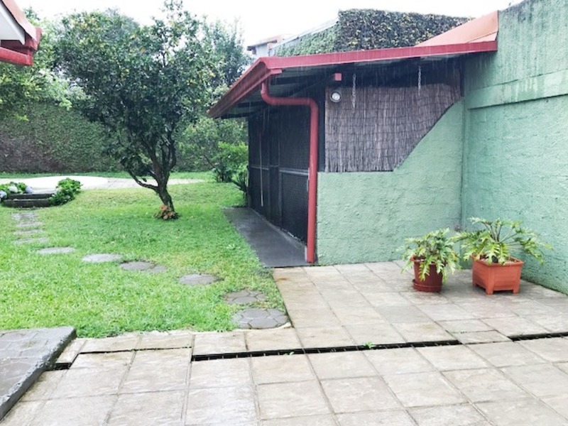 Bonita Casa de Una Planta con Amplios Jardines en San Ramón de Tres Ríos. The house has a hall, guest bathroom, living room with fireplace with coffered ceiling, family room with fireplace with BBQ area and little bar, dining room, large kitchen with thermoformed top, laundry room and covered patio, large backyard with a large garden with a small fiberglass pool; It has a cellar and a large kennel. TV room, 2 large light patios towards the bedroom area, 3 bedrooms, the main one with closet and full bathroom with toilet and bidet, 2 secondary bedrooms with closet sharing full bathroom. The house has flagstone and porcelain floors, beautiful wooden details, excellent property conditions. It has a large and beautiful front garden and parking for 3 cars, 1 covered and 2 in open space within the property. The house is delivered with lamps, curtains, dishwasher and grease extractor. The house is located in a private residential with 24/7 security with controlled access, it has a large park. Maintenance fee 27,000 colones, includes surveillance, maintenance of main green areas and park maintenance, pets are allowed