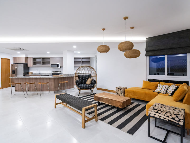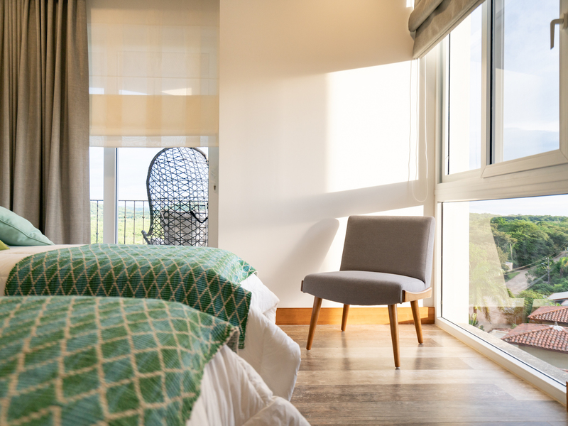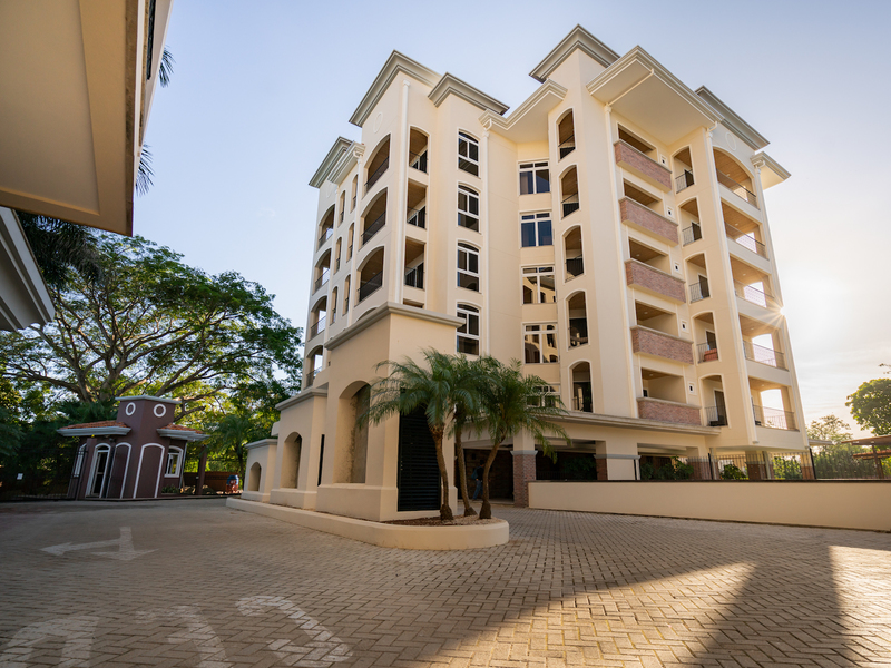 Our condominiums are located in Playa Langosta, set amongst magical white sand and a turquoise water ocean, just one block from the beach. Walk through our beautifully landscaped tropical gardens, take a dip in the resort style pool and complete your day in a quiet moment on our 7th & 8th floor sundeck, watching the sunset with a glass of wine taking in the panoramic views of the mountains and Pacific Ocean.