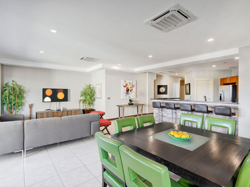This lovely 3 Bed 2.5 Bath Condo is located in the Peninsula Condominium complex which is a 64 unit residential project, with two buildings with 32 condos, each with eight floors built over an underground parking facility. They are located in the upscale beach community of Playa Langosta, just a mile south of the bustling town of Tamarindo where you will find a plethora of restaurants, shopping options, supermarkets, banks, beach activities, and nightlife. The condominium building itself as well as the grounds are impeccable. There are large balconies off the master bedroom and main living area leaving plenty of space to enjoy outdoor living. If you are looking for a second home, vacation rental property, or retirement location, Peninsula Condos are a must-see!