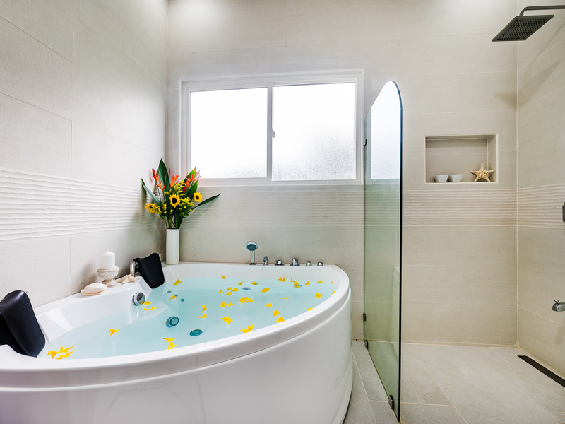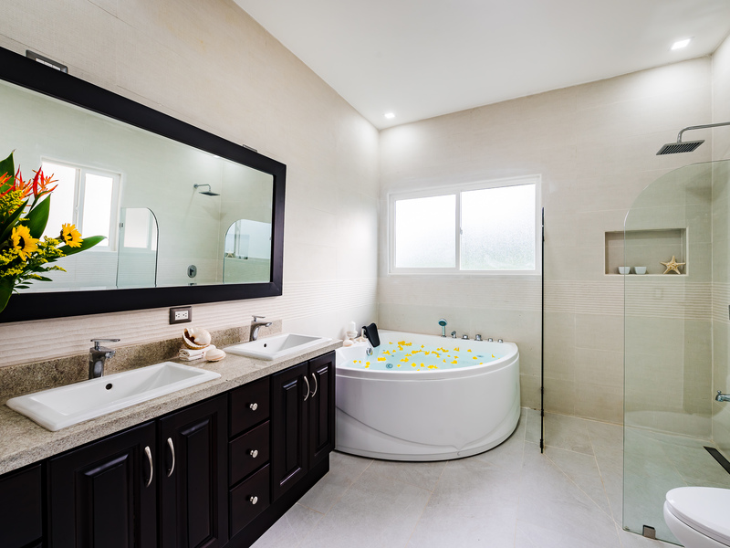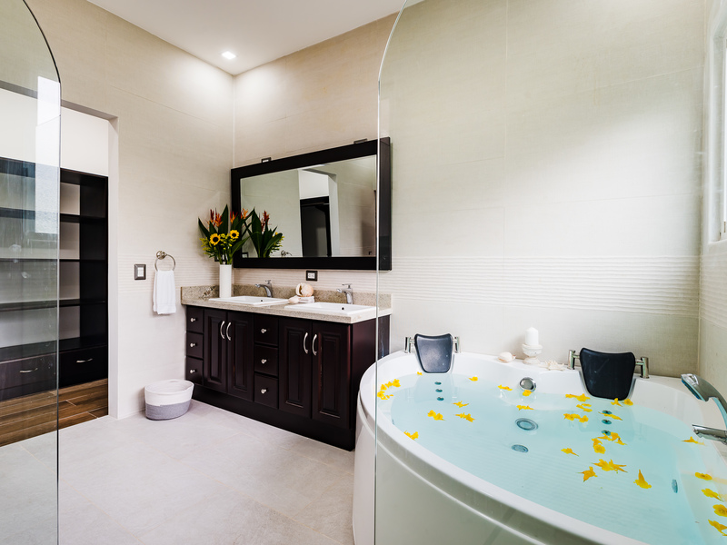 The Master Bedroom, encompassing the entire second floor, is luxuriously designed as a sanctuary for ultimate tranquility. The over-sized bedroom suite has a spacious sitting area, opening on to a private terrace, overlooking the pool and forest beyond. The master bathroom is huge, with a two-person jacuzzi tub, a separate rain shower, and a gigantic walk-in closet.