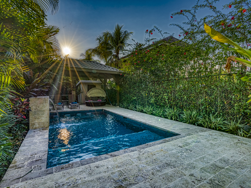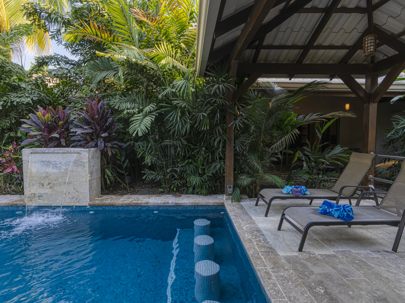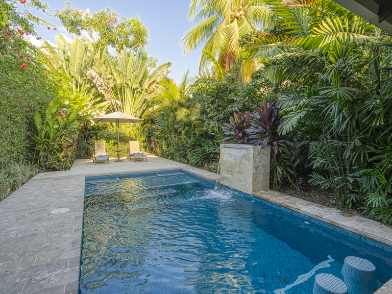Each of the villas features its own terrace with a dining table for six and a BBQ area. The two villas share a tropical outdoor paradise with a waterfall pool and a wet bar. The perfect paradise is the ideal location for mediation, yoga, or Pilates. It’s also the perfect place to catch some sun on the loungers or relax on the outdoor couch. If it’s a hot day, enjoy the cool water and swim some laps. The pool area is surrounded by over flowering greenery and plants so you’ll feel like you’re in your own tropical rainforest.