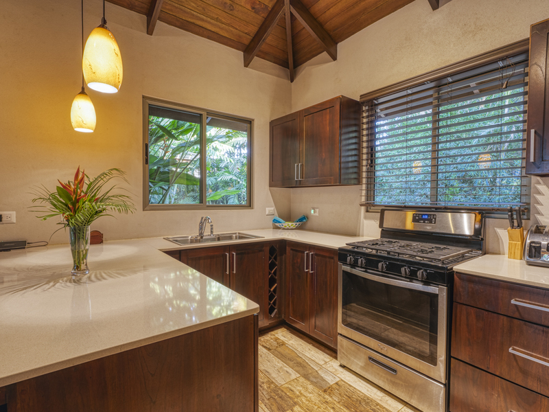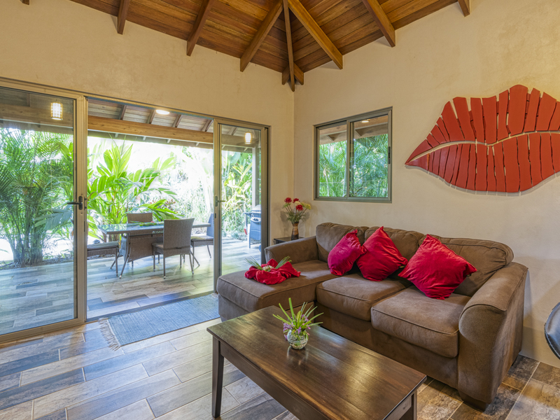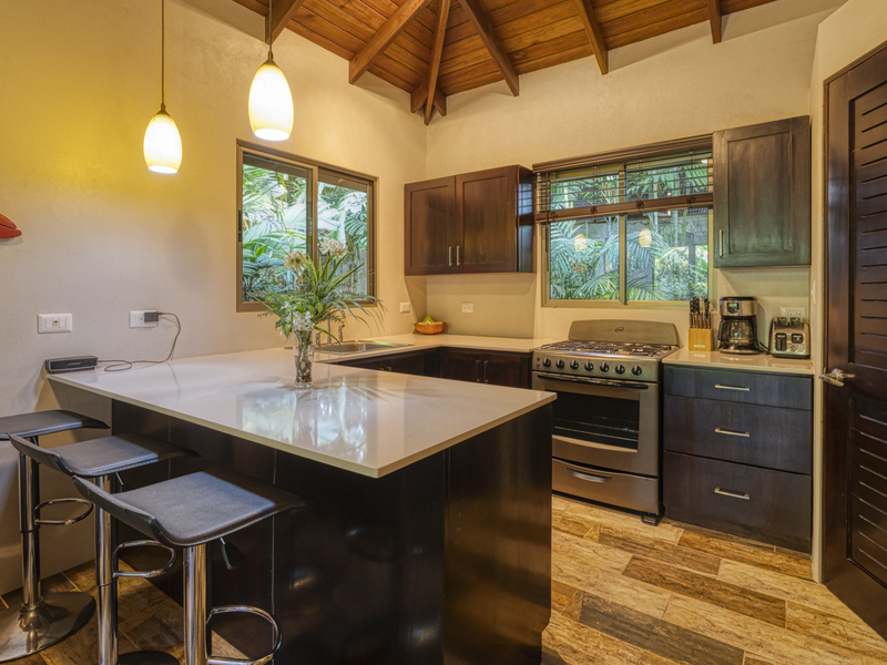 Each of the villas includes a gourmet kitchen with high beam ceilings, wooden cabinetry, and stainless steel appliances. It also features a large breakfast bar with four high-top black stools, making casual eating accessible. The previous owners are also leaving their small appliances, including an espresso machine, a blender, and a toaster. The two-bedroom villa features a blue sofa that transforms into a sofa bed in the living room, whereas the one-bedroom villa features a brown plush couch in the living room. Both options would provide extra sleep solutions if needed. Both living room areas include a Bose stereo system and a smart TV. There is also easy Wi-Fi access throughout the villas.