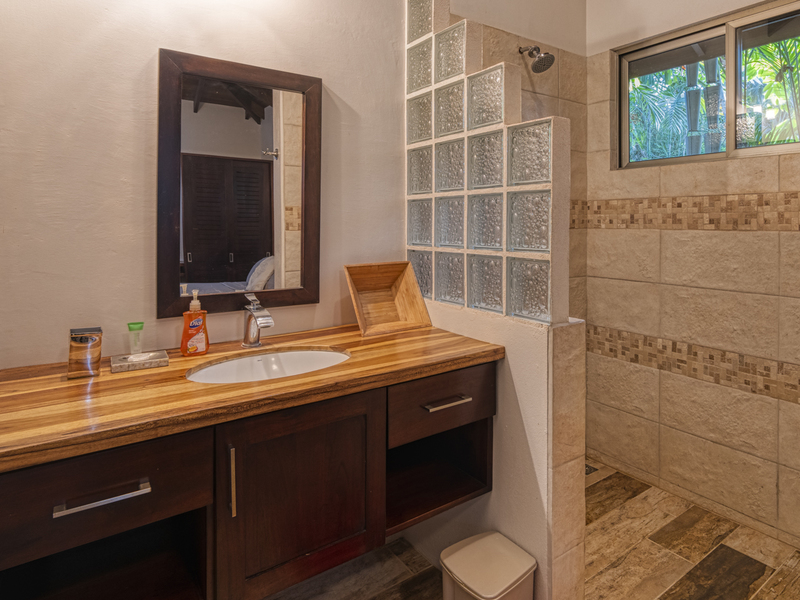 Each of the bedrooms includes a king-size bed, a wooden wardrobe, and a built-in desk. The high ceilings and ceiling fans bring the cooler air in. Each of the bedrooms includes a private bathroom with wooden countertops and storage. It also features a tile shower with window access.
