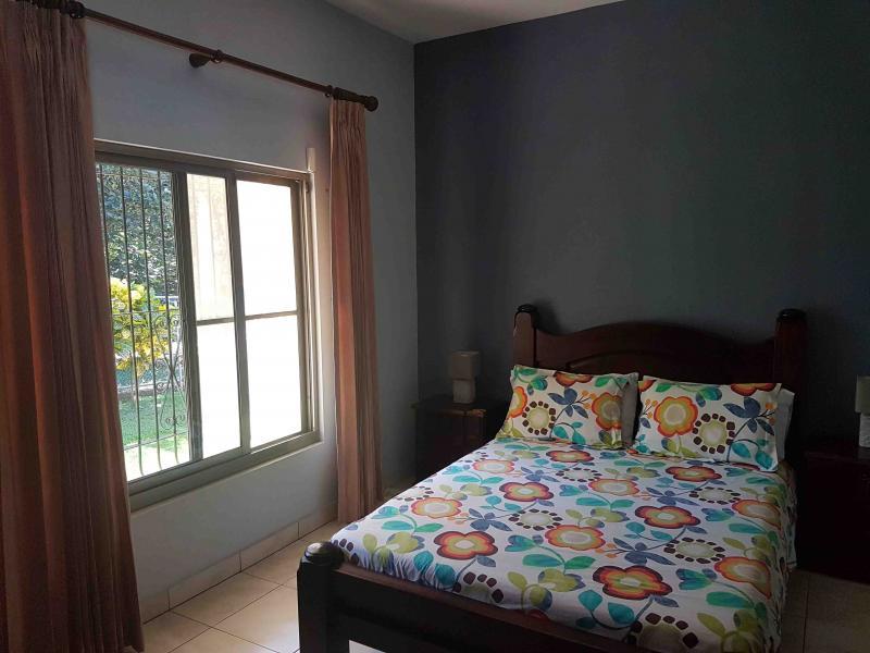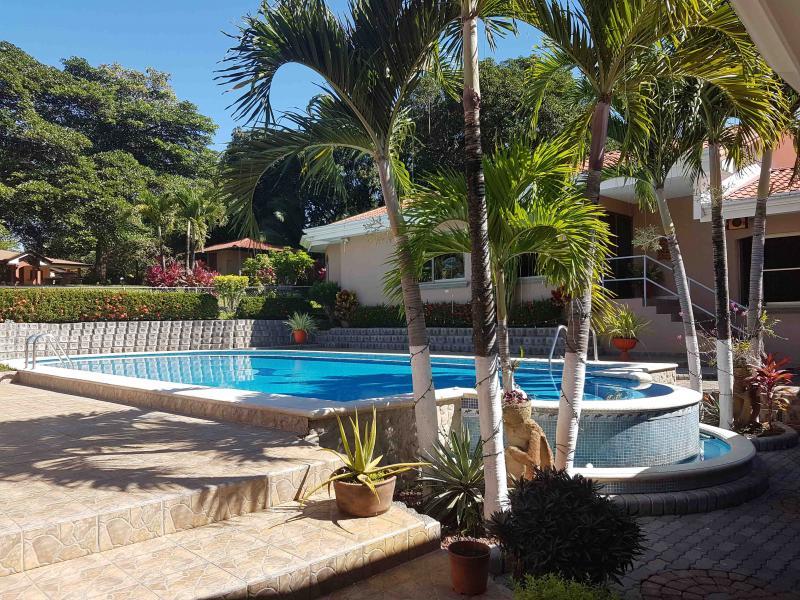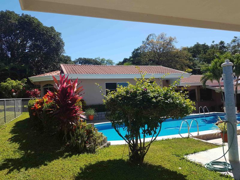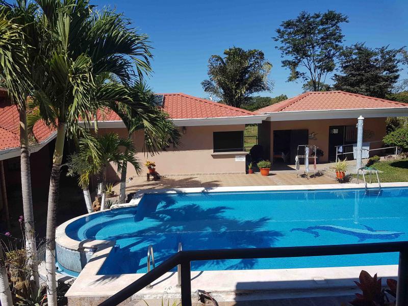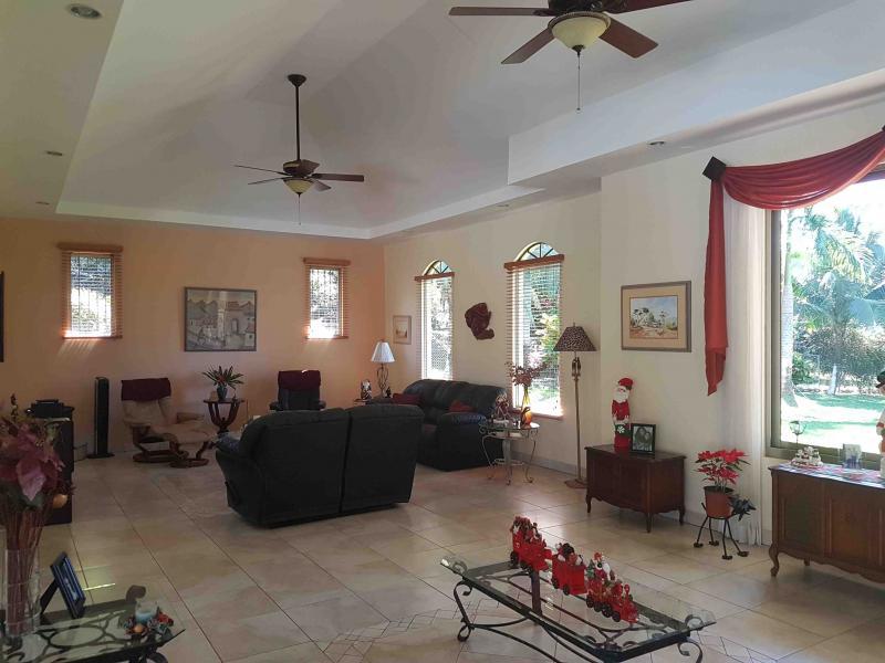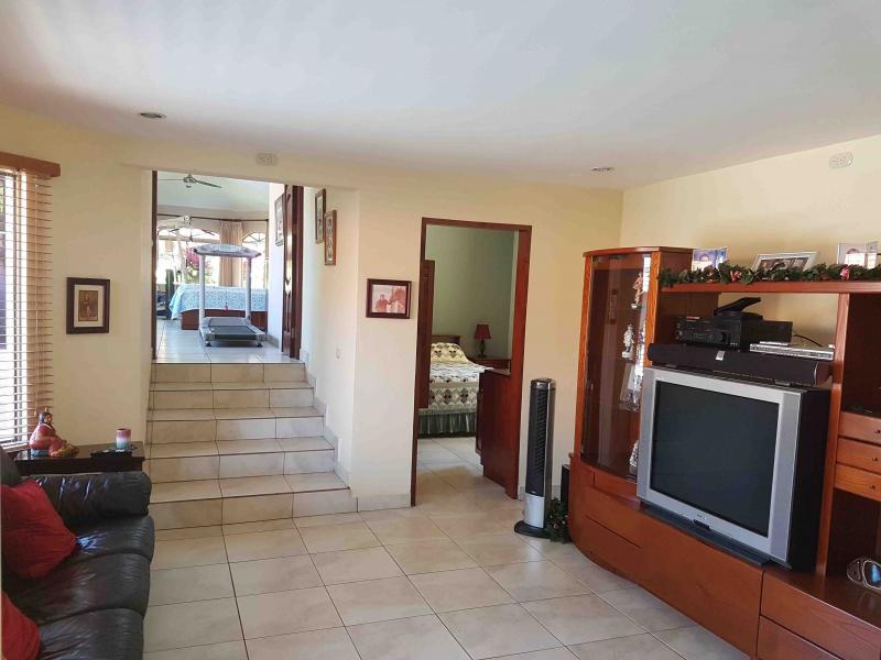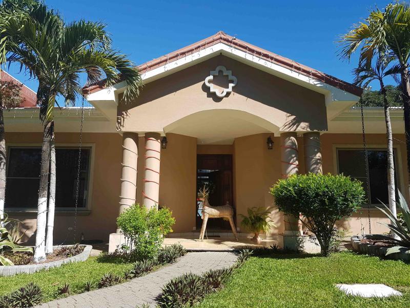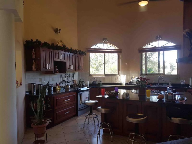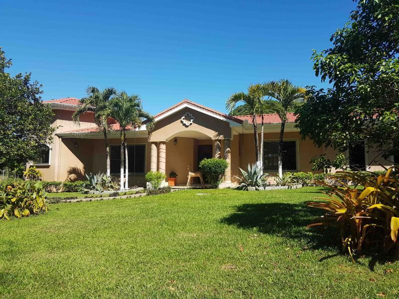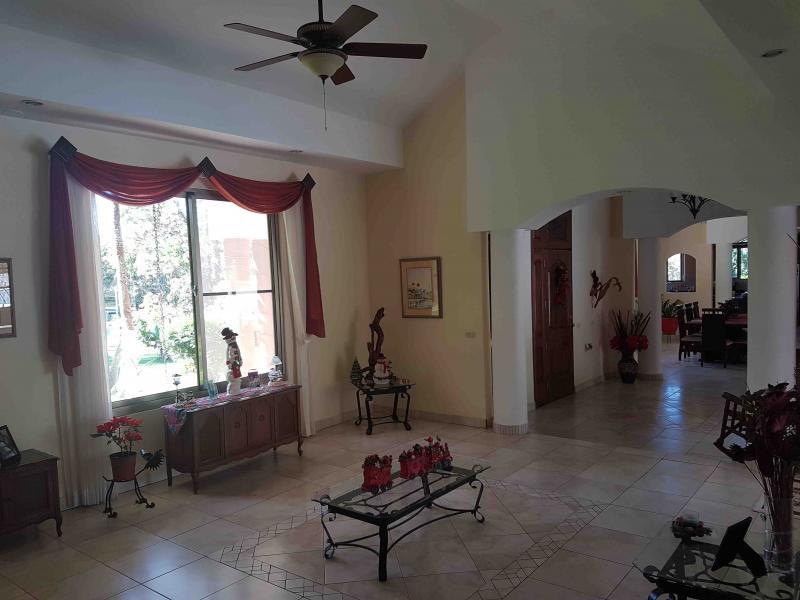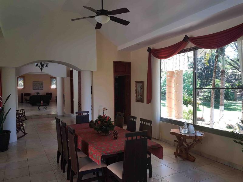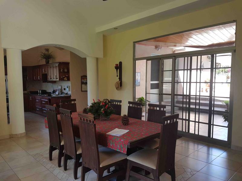 The house is located off the main street, five minutes from downtown San Mateo, on the road to Jesus María. It has a large front garden. It was designed in the shape of a horseshoe around the pool, so that from all rooms you have a view of the pool. There is access to a hall that communicates with the living room and dining room area that are independent, after the dining room it has a very large kitchen with wooden furniture and equipped with a gas and electric stove, it has a pantry room, the closed garage continues for two vehicles and behind it is the utility room with a full bathroom. From the main room, which is very spacious, you go to a TV room and from there you access two beautiful secondary bedrooms that share a full bathroom with beautiful finishes. You continue along a corridor that will take you to the main room, which is very spacious, which has a bathroom with separate shower and Jacuzzi. In addition, you enter a large walk-in closet with fine wood furniture. From the main room you can go out to the pool area. The house has large windows that allow contact with the pool and green areas. It also has an exclusive dressing room and bathroom area for the pool.