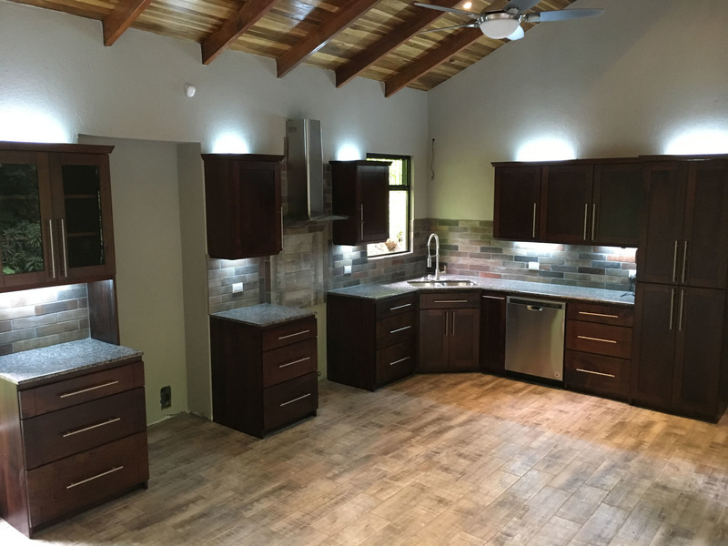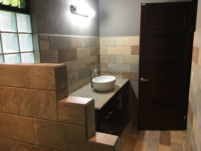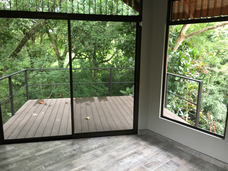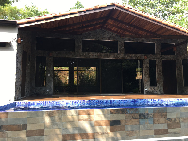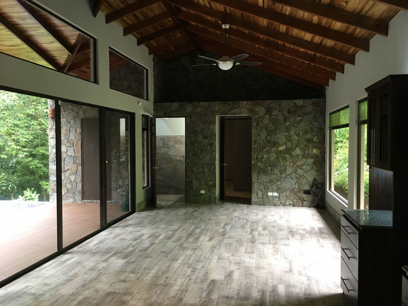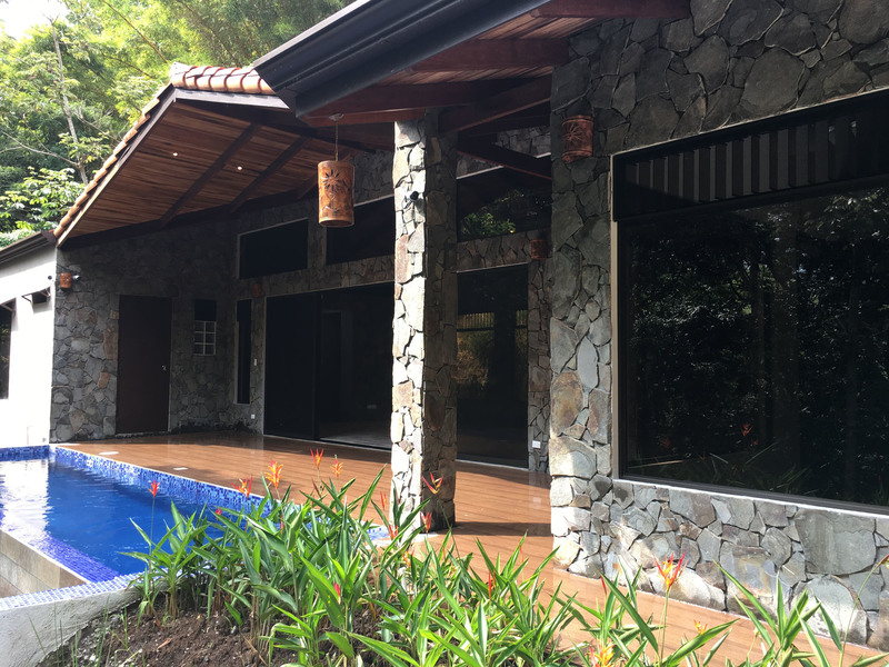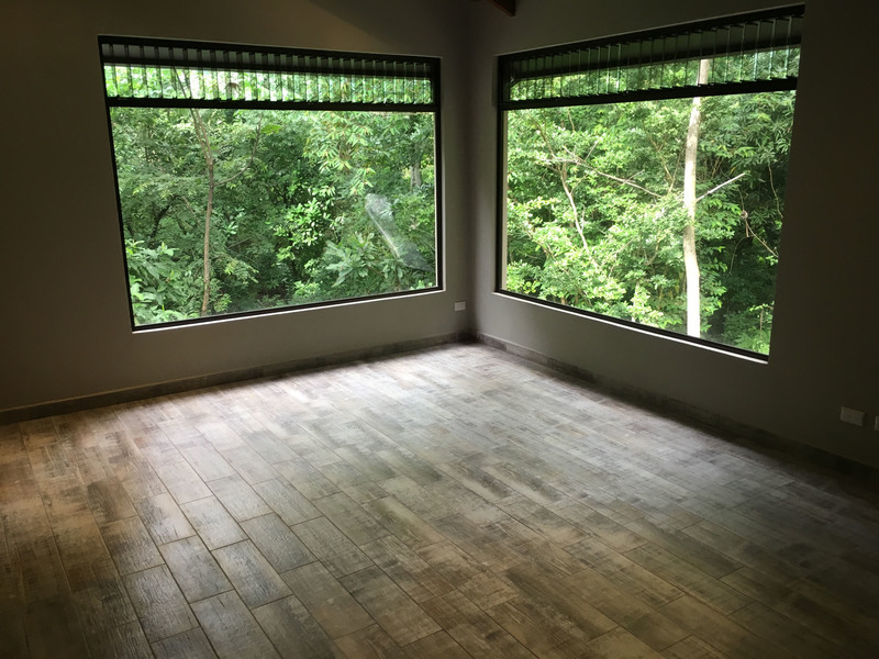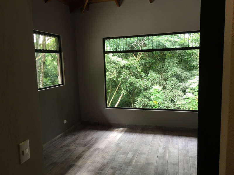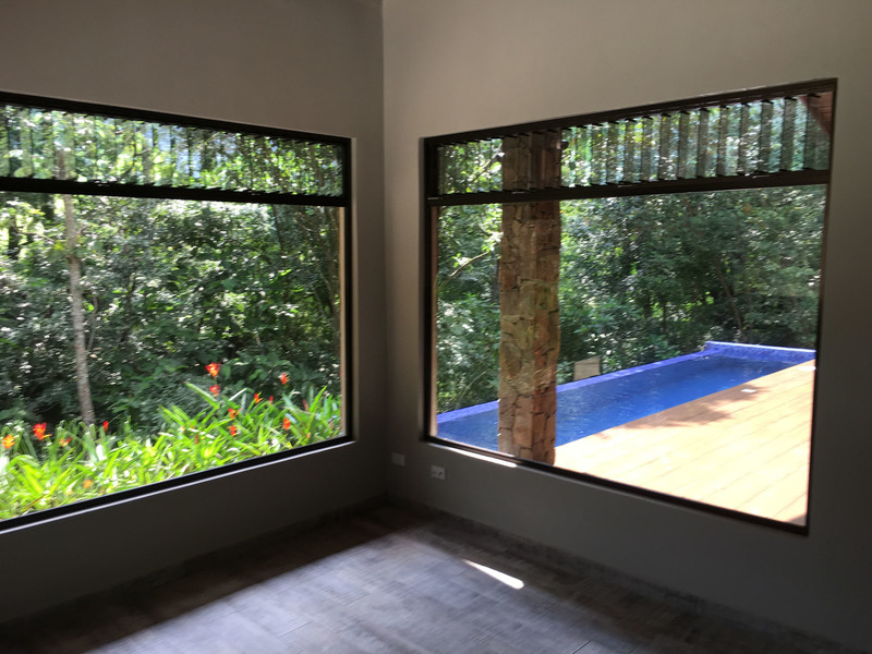 The “ADIRONDACK” is a Luxury House with a Guesthouse, combined size of 2196 square feet (204 m2) and has been specifically designed for lot 4. The view, privacy, and accessibility have all been taken into consideration. The house has a height of 15 feet. All ceilings are finished with gorgeous tongue and groove wood. The sliding doors in the living room allow you to open up the house creating an amazing outdoor feel, even inside. The doors lead out to the covered patio area that is privatized by the shape of the building. The infinity pool is the focal point. This 2 bedroom, 3 bath, luxury home which includes a separate Guesthouse with a 3rd bedroom and 4th bath, is sure to please. The master bedroom has an ensuite washroom. The living room/kitchen look directly at the pool and the jungle view! The kitchen cupboards and all doors are custom, hand-made from Cedro (Spanish cedar) wood. Again, “ADIRONDACK” is high quality construction. The roof is clay tile with another metal roof underneath. This is the best type of roof to have in Costa Rica (reduces the noise of the rain, helps to insulate from the sun) and is one of the most expensive. All materials used to construct this home are of the highest quality. “ADIRONDACK” has an alarm system and security cameras that can be controlled and viewed from your smartphone! Plus an inground irrigation system! Don’t miss out on this opportunity to be part of the Selva Rio Estates growing community.