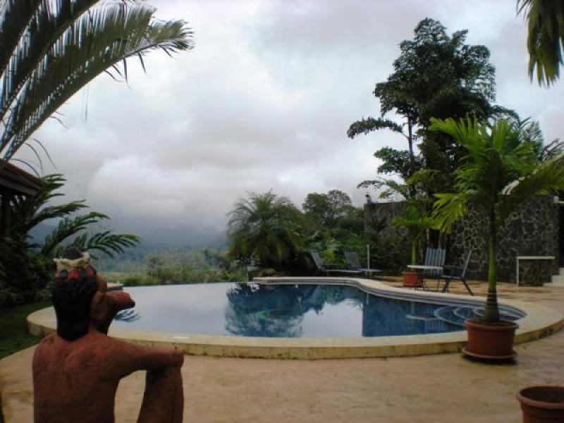 The access is an easy 2 kilometers from the paved road as you enter the gated, circular driveway to the house, bounded by royal palms and lush tropical landscaping. The 2,368 square foot home is wrapped in terraces to enjoy the magnificent views. The first floor living room, dining room and kitchen features an open floor plan with vaulted, tropical wood ceilings and easy to care for ceramic tiled floors and granite counters. One of the guest rooms features a full en suite bath and could be used as a master suite. The second bedroom is currently used as an office. The entire second floor is an additional master suite with its own private balcony overlooking the pool, stable and views.