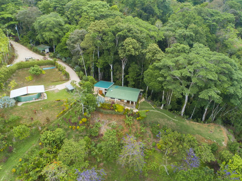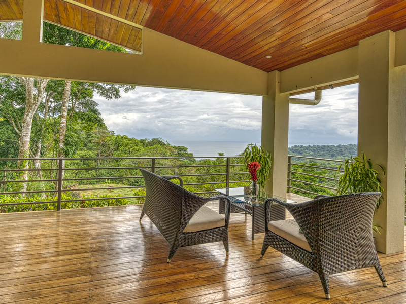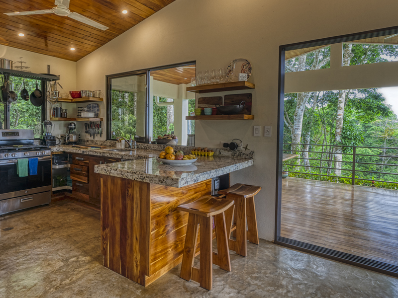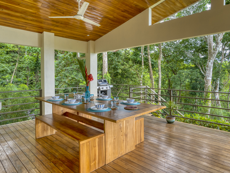 The private dining deck borders the year-around creek and monkey corridor. The property is