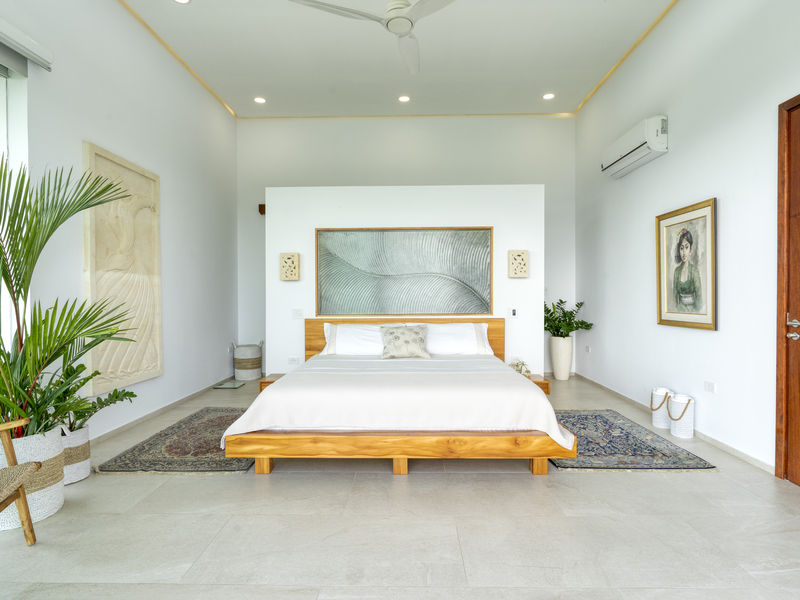 Each of the master bedrooms features a king-size bed, a handcrafted wooden bed frame and