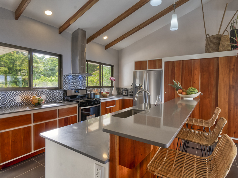 The modern design of this home delivers both privacy and openness. The solid concrete walls are accented with gorgeous teak wood. Large glass windows either face the ocean or the lush rainforest jungle.