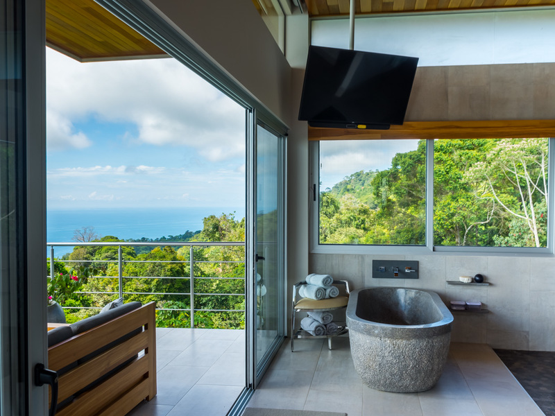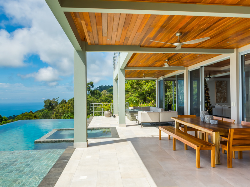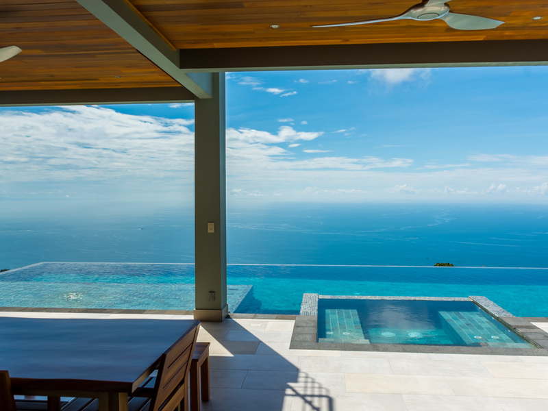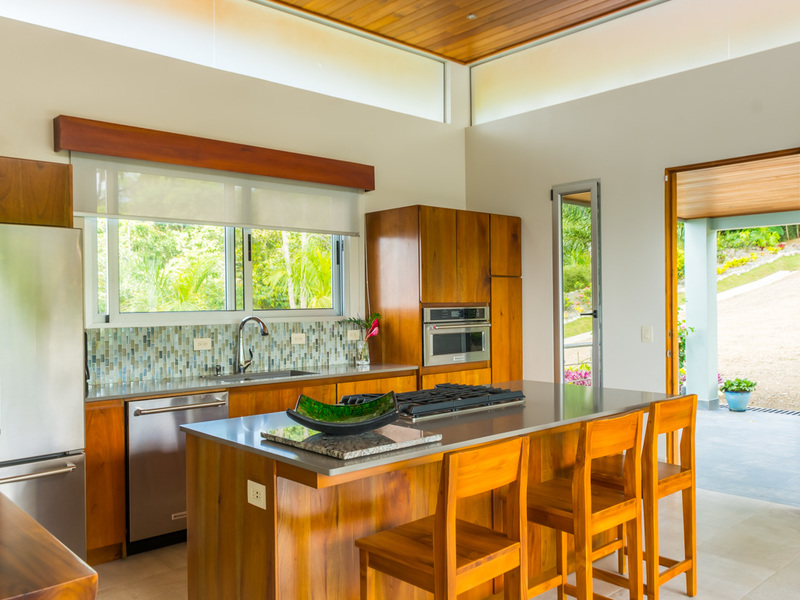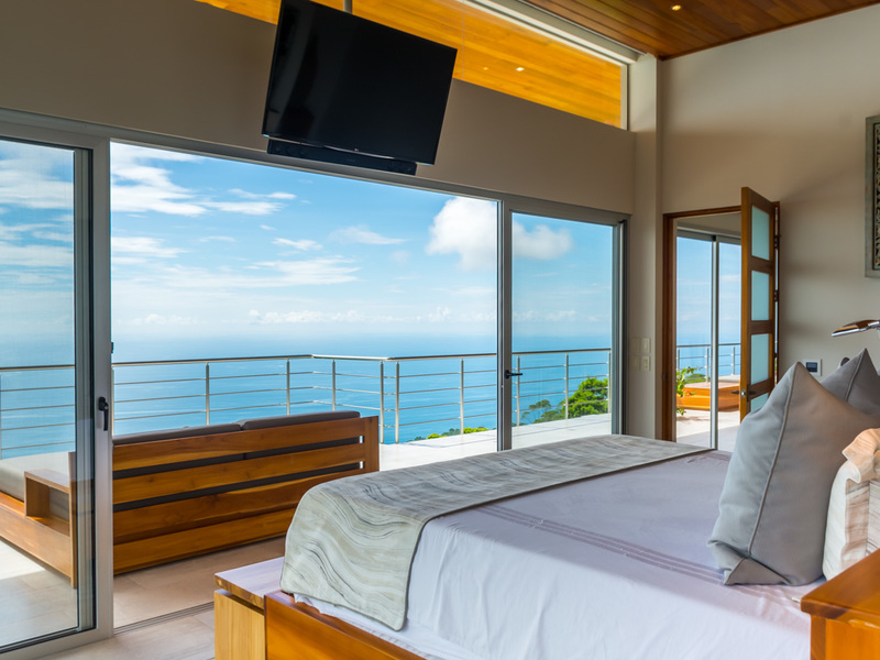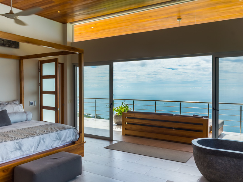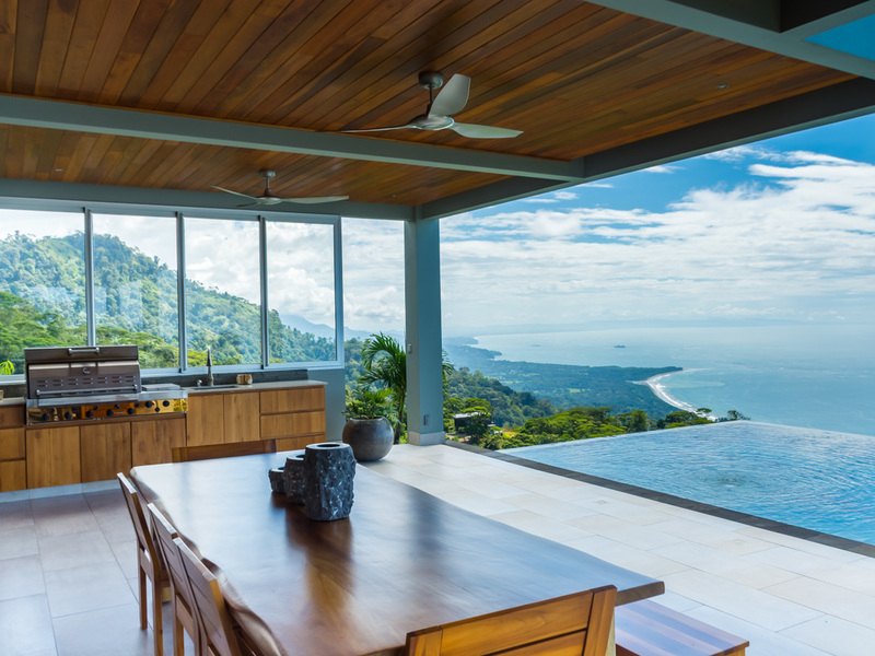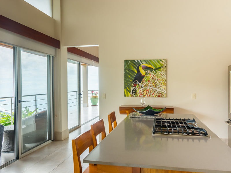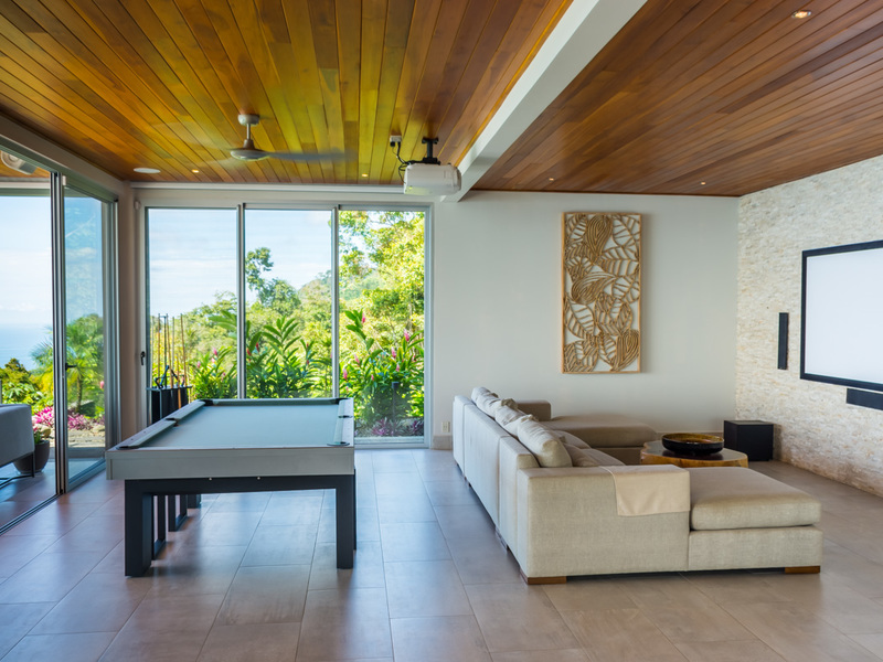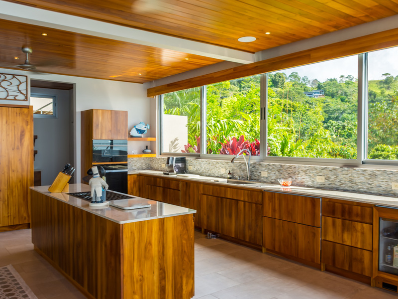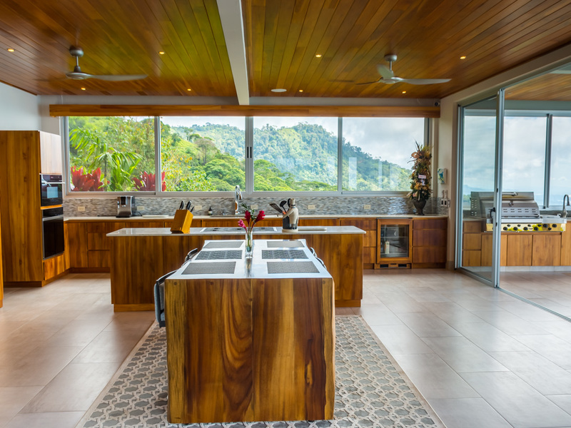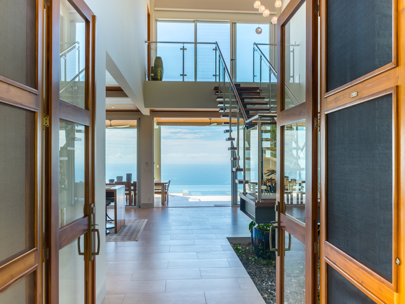 Amazing ocean views are seen through the glass doors and windows of this jaw-dropping luxury home as you approach. You will frequently be greeted by toucans, monkeys, or other beautiful wildlife in the large trees with epic ocean views in the background. When you pull into the paved and covered and head towards the front door, you can feel the environment’s natural beauty. The impressive luxury touches of this home immediately become evident. As you head toward the front door, you notice the lush and colorful landscaping and tropical plants. When entering the house, the floor plan opens to a vast vantage point of 180-degree ocean views through the all-glass main area.