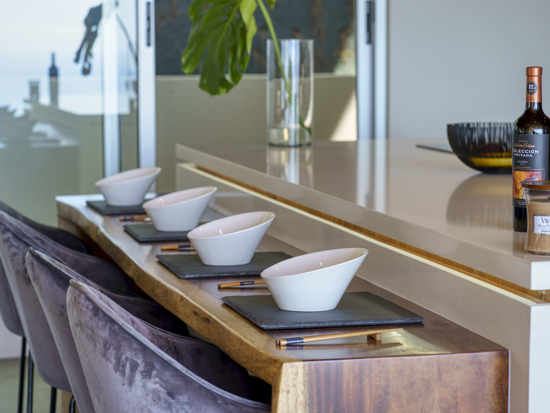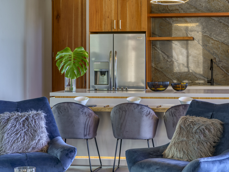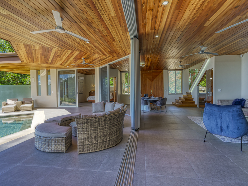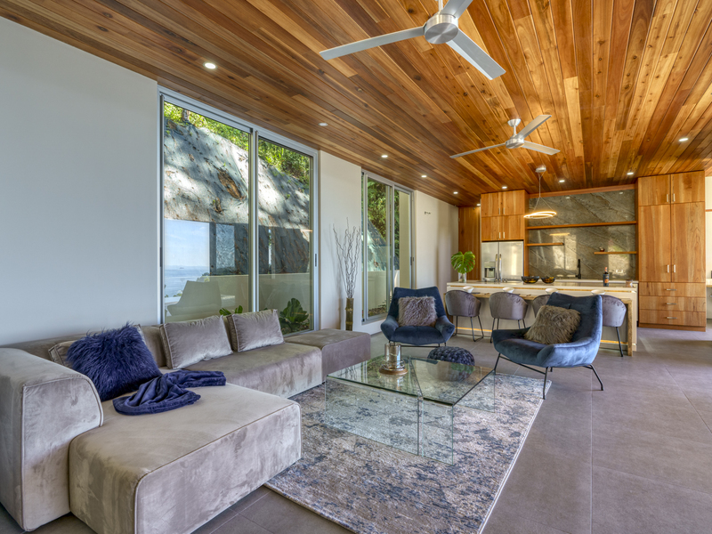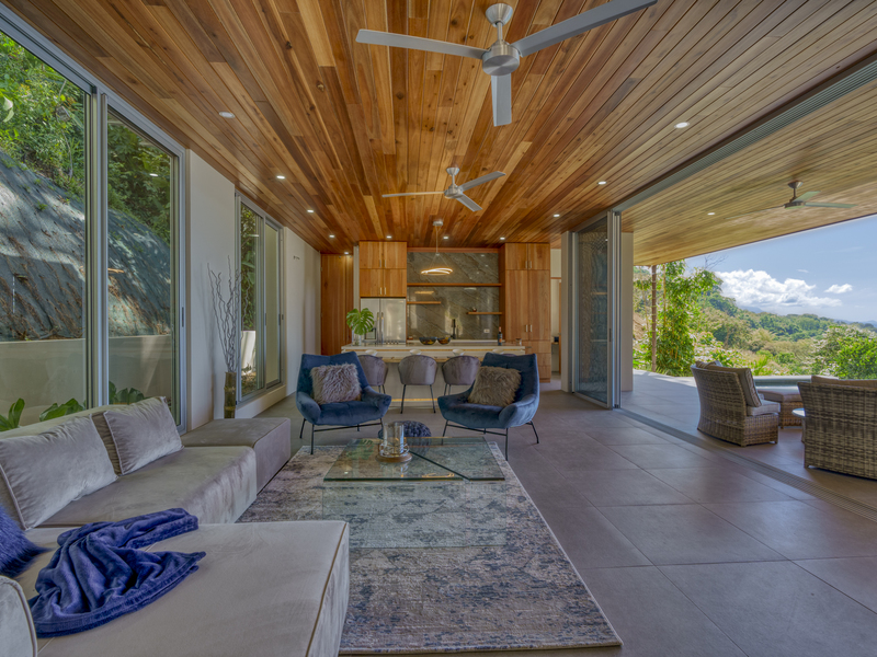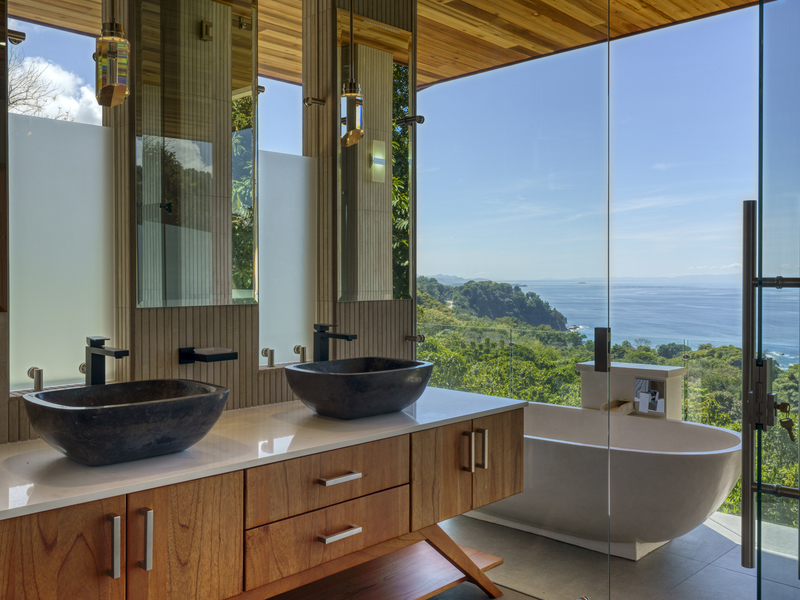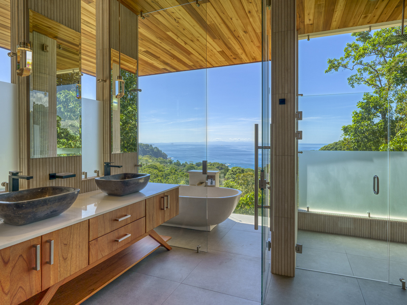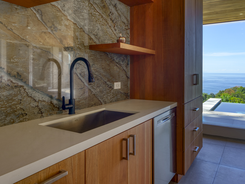 Each room features large glass sliding doors to remove any barriers between the interior and the cool coastal breeze. The master bedroom suite features an open-air bathroom, so you don’t have to tear your eyes away from the view for even a second. Start your mornings looking for whales while you shower and finish with evenings stargazing from the bathtub on your balcony. The two other bedroom suites also capitalize on the views. They are located on the top floor and boast ocean views from the comfort of your bed. Each ensuite features an outdoor shower and double vanity with polished stone sinks. Full-length sliding doors allow you to invite healing ocean air and the songs of the jungle inside.
