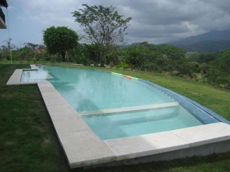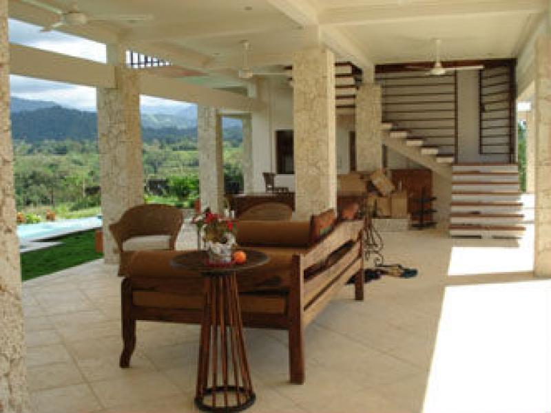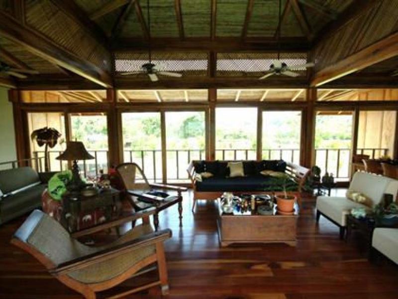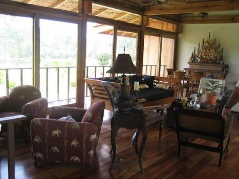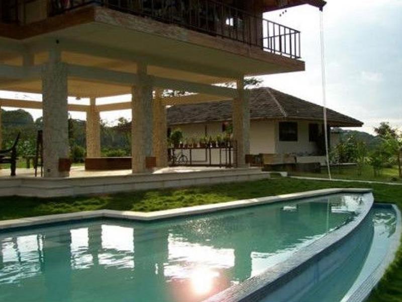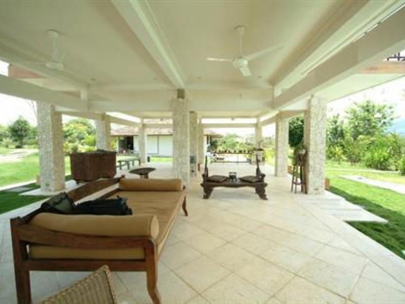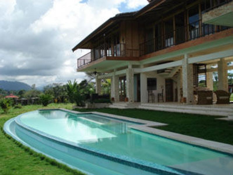 This estate is located in the town of Naranjito, just 20 minutes from Quepos/Manuel Antonio. Set on a flat ridge with views of a small valley and the 8000ft mountain range of Fila Chonta, this acre estate is a masterpiece Enjoy the sun with cool breezy afternoons and fresh nights. This fantastic home, is the perfect location to enjoy nature and the country life of Costa Rica. With South Pacific influences, the home features an exotic blend of high end finishes and eclectic furnishings and the design is the perfect blend of outdoor living and chic design. The bottom level of the home is all open air with a unique design that affords maximum living and entertaining space alongside the 75 foot long pool. There are coral stone columns along with Asian treasures all throughout. Upstairs you will find the main living level which features a gourmet chef’s kitchen with beautiful granite counter tops and slate flooring. The living area is decorated with fine tropical hardwoods. The Master bedroom boasts over sized walk-in closets, an en suite living and TV room and an amazing master bathroom. There is also another bedroom on this floor. The main house is 5000sq. feet and there is also a caretaker’s home with one bedroom, 1 bath, and a kitchen measuring at 1000 sq. feet.