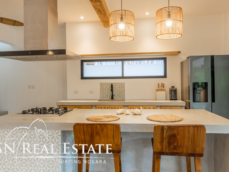 The spacious kitchen has a big island bar and the living room/ dining area have nice views of the jungle. There are big sliding doors that connect to the terrace and pool area.
