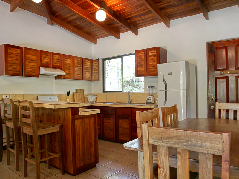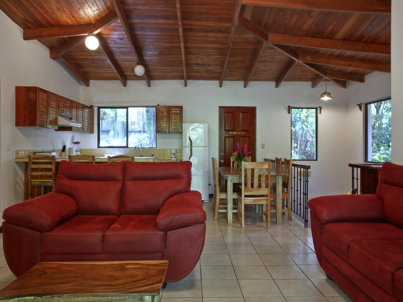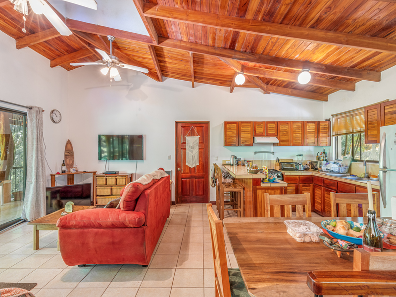 Casa Zuma a fully furnished, three bedroom, three bathroom home nestled under a canopy of tropical trees in a secluded community that's only a few minutes drive to the beach. Beautiful native hardwoods are used throughout for a fantastic finish, including on the large covered patio that spans the entire front of the home, providing a spectacular view of the jungle terrain. Enjoy visits from monkeys and other local animals who share the shade trees and natural creek that runs along the front of the property.