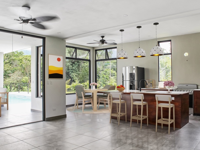 Be the first to own this modern brand new home. Located in the heart of Ojochal, less than 5 minutes from the highway, and all the amenities of the area such as restaurants, shops, supermarkets, pharmacies, doctors, hardware stores, and more. Within 10 minutes of 2 beaches, and several more not much further away. Sip your coffee while watching the sunrise over the expanse of mountains, and continue to enjoy the fantastic ever-changing mountain view throughout the day. The house is set on a 3⁄4 acre lot, backing onto jungle, within a boutique 4-home gated development.