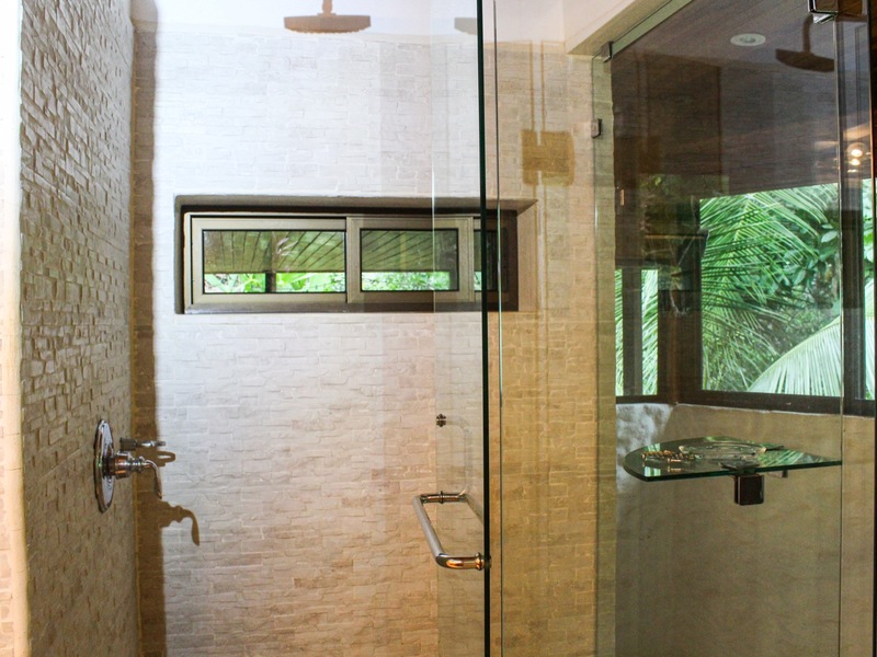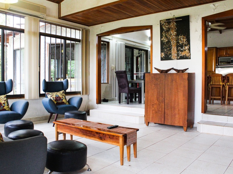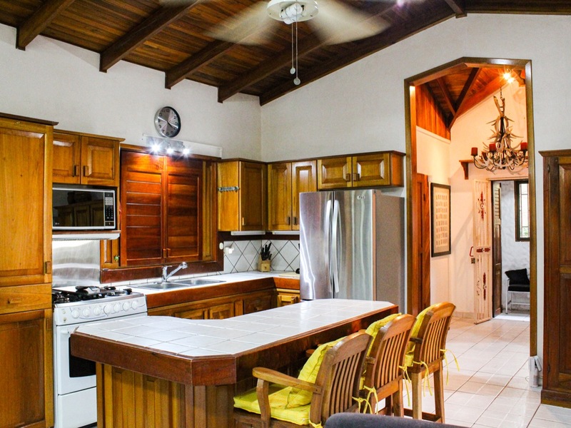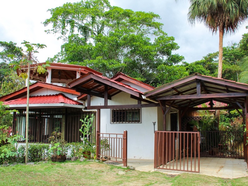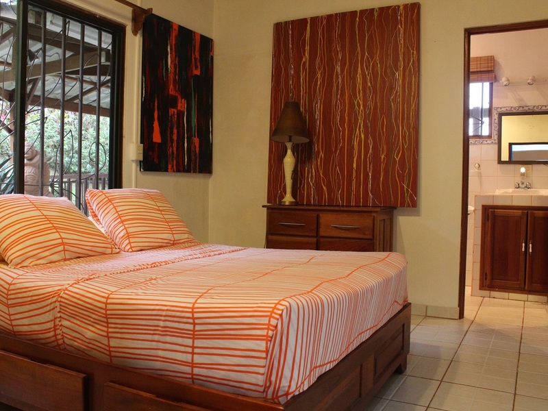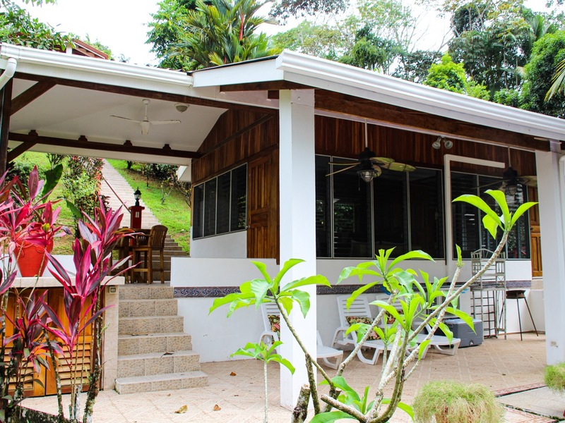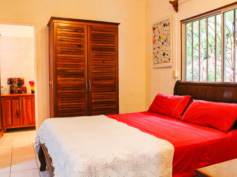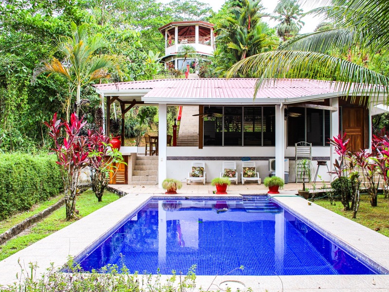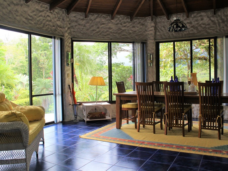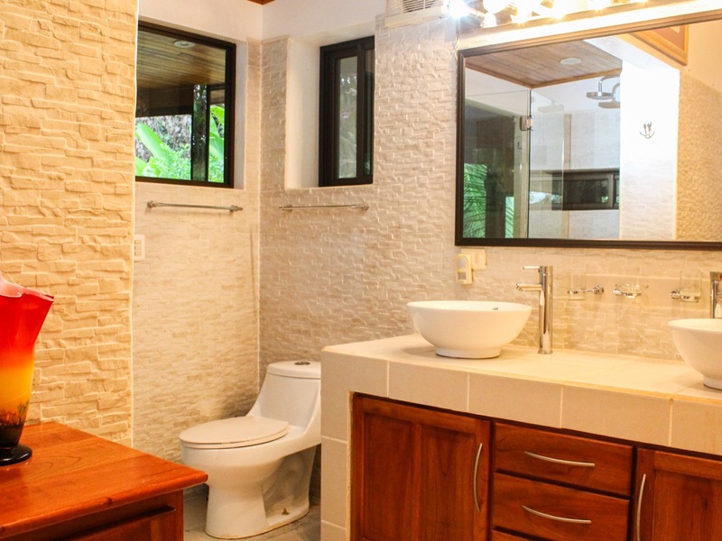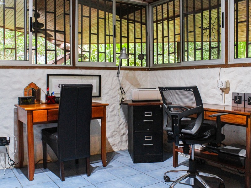 truly appreciated! The house features a fully equipped kitchen, a dining room with patio doors and mountain views, spacious and tastefully decorated living room, an office, laundry room and guest bathroom. There are 2 air-conditioned bedrooms, each with ensuite bathrooms. A curated collection of art adorns many walls throughout the house. A tiled staircase leads down to the guesthouse and beautiful pool. A covered lounge area is adjacent the large swimming pool. The guesthouse features a dining terrace, kitchenette, 1 bedroom and a bathroom. Ojochal is a quaint village known for numerous fantastic restaurants, and easy access to pharmacy, doctor, spa, groceries, and 2 great beaches Playa Tortuga and Playa Ventanas. Wind your way through the gorgeous jungle to reach this property is less than 10 minutes from the highway.