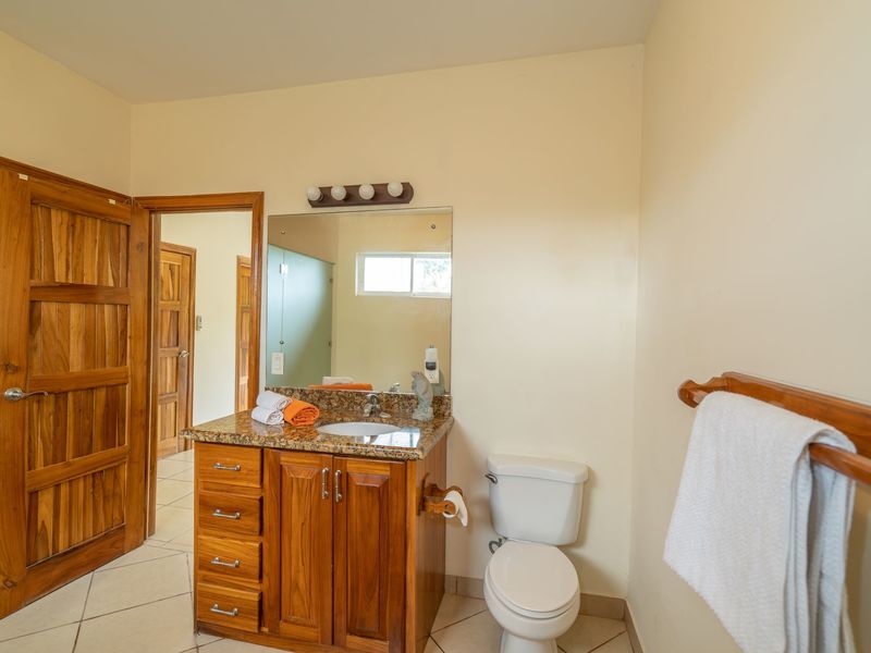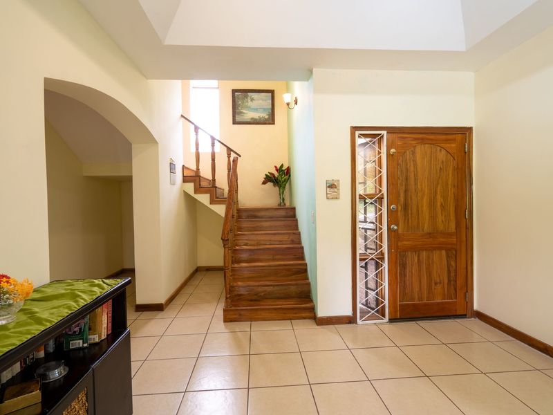 A rare find in Costa Rica, this home will appeal to those seeking a more traditional 3 bedroom style home based around the family and home activities. There are 2 bedrooms on the main floor and the huge master bedroom suite and walk-in closet with an ensuite and large terrace upstairs. Attached to the house as you exit the kitchen is a spacious enclosed patio area next to the pool and with enough space to host a large family and friends barbecue get together. A gentle breeze passes through the home for natural cooling and fresh air.