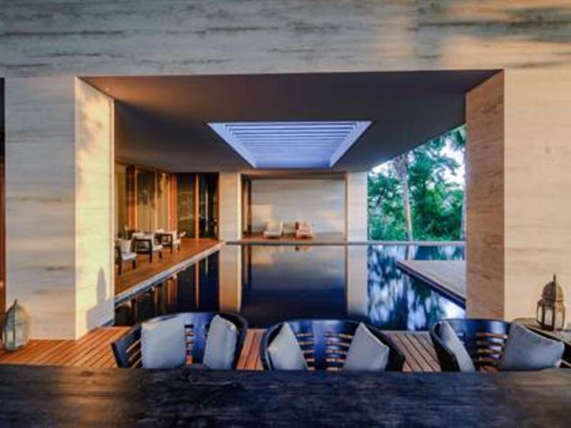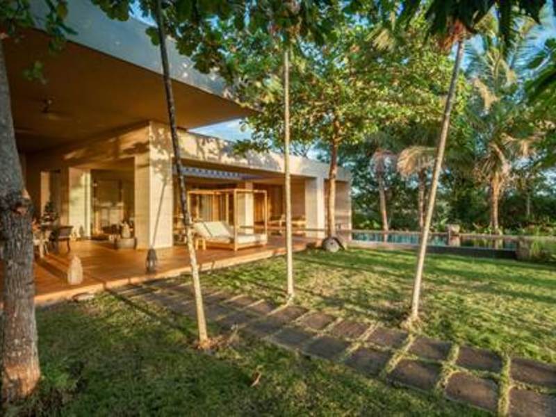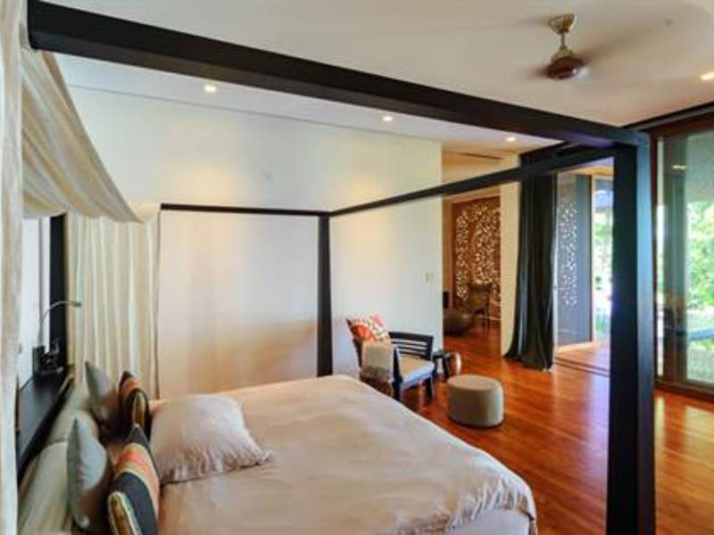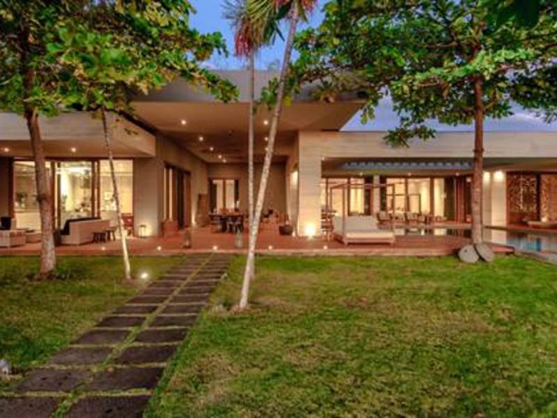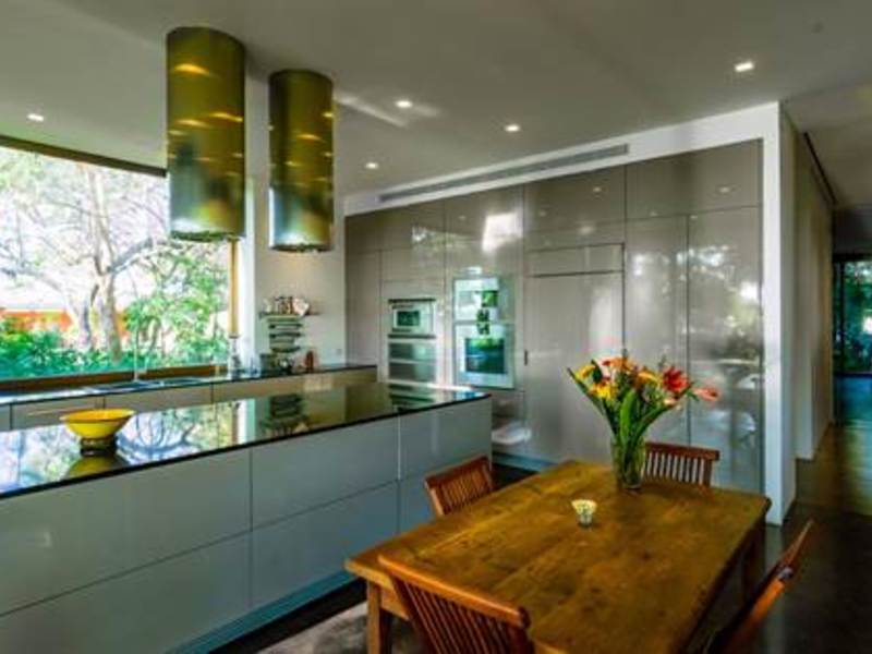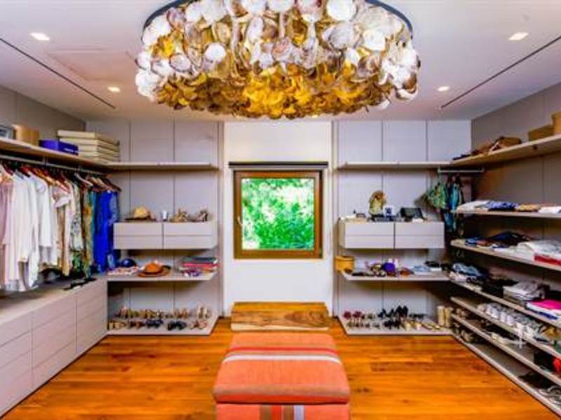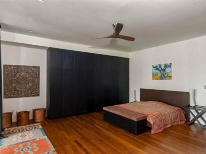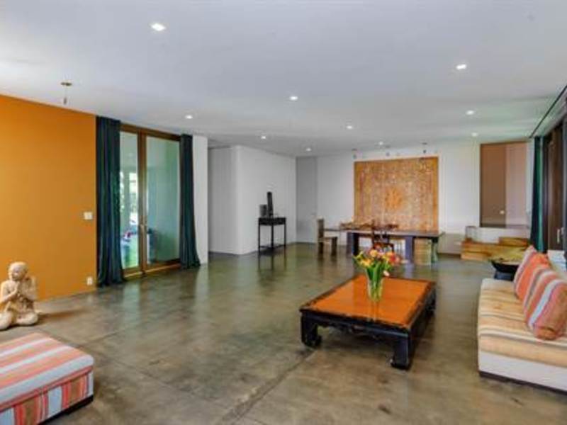 Also opening onto the large pool area is a generous master suite featuring floor to ceiling glass sliding doors and handmade Balinese mandalas. Two separate bedrooms allow for exceptional space and privacy. The walk-in closet is custom designed. Taking advantage of the exceptional views, the master bathroom has a gorgeous custom Nero Assoluto granite soaking tub. The massive rain head shower opens into a beautiful walled outdoor garden and shower. All floors in this space are native teak.