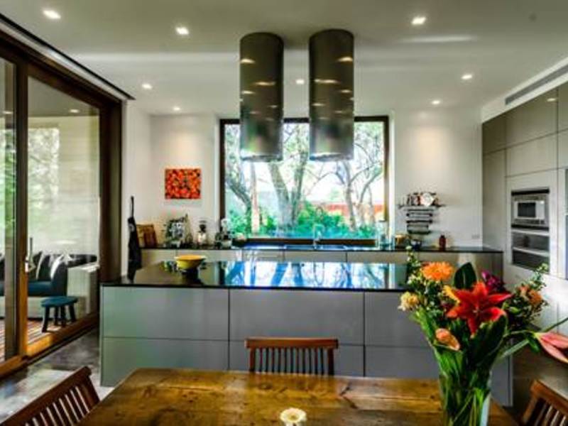 Downstairs, adjacent to the main living room, gourmets will appreciate the kitchen cooktop, steamer, and warmers all Gaggenau, imported from Germany. A custom venting system imported from Brazil is made by Turboair and provides a unique aesthetic. This state-of-the-art kitchen features granite countertops, a SubZero refrigerator, Bosch dishwasher, and a custom-built walk-in cellar/pantry kept at a constant temperature of 12 degrees Celsius, perfect for food and wine storage.