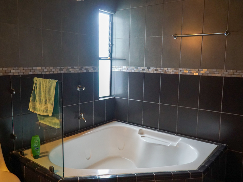 The home features a master bedroom with en-suite bathroom (equipped with Jacuzzi tub) and small deck with view. There are two guest bedrooms with a shared bathroom.