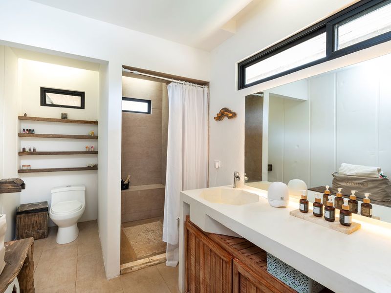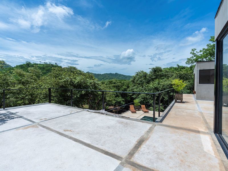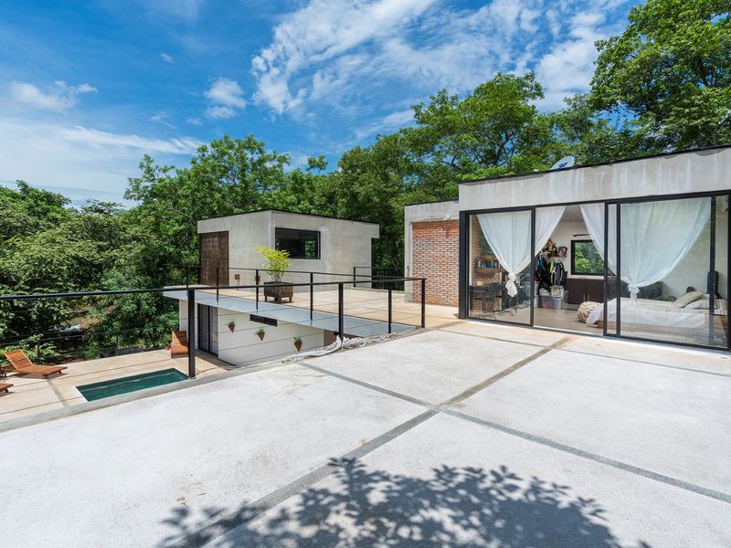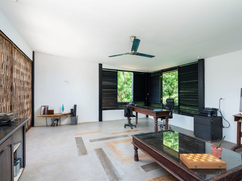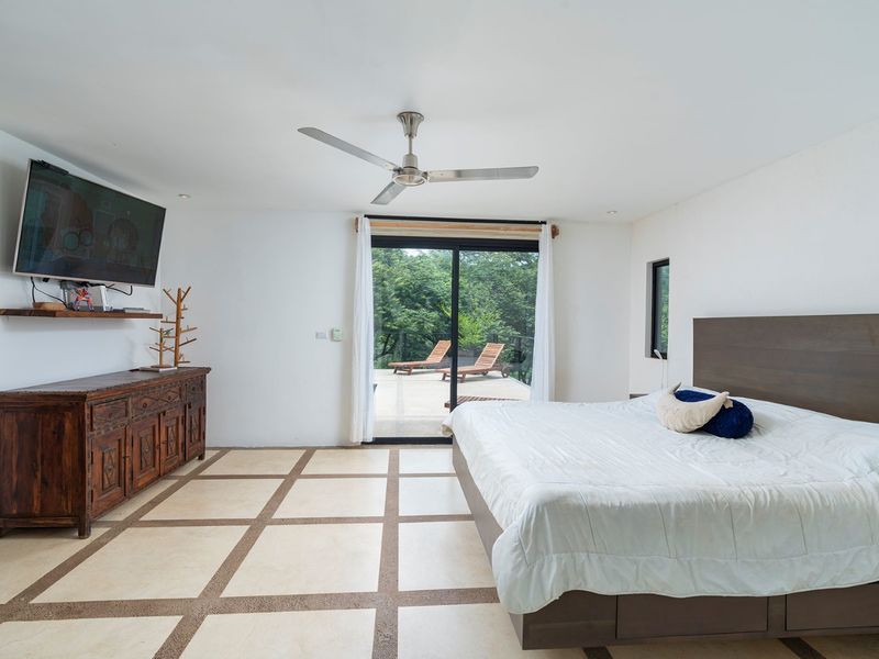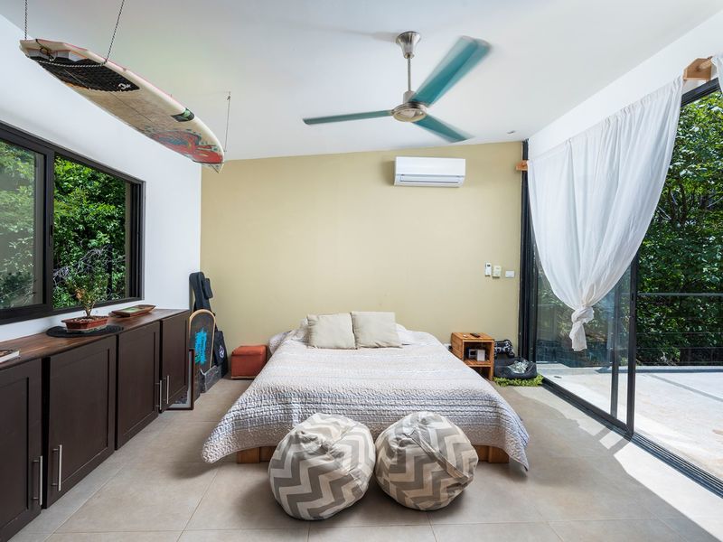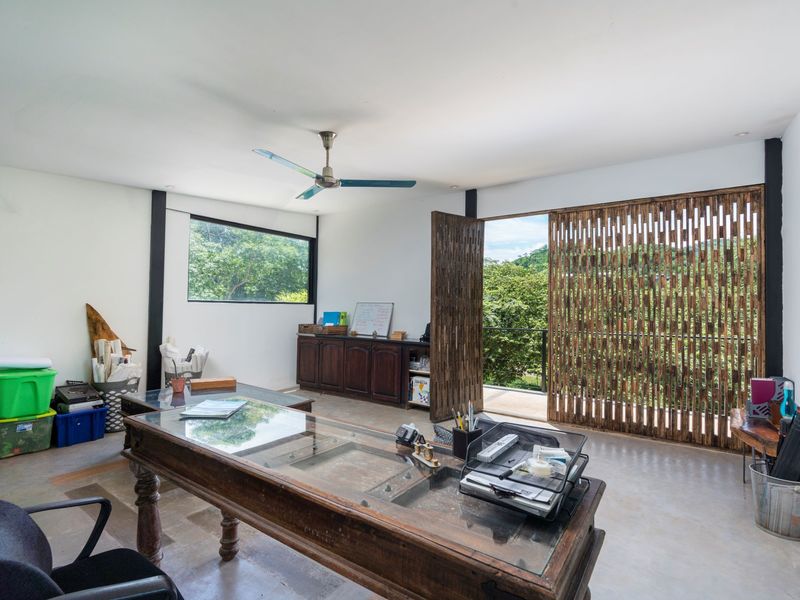 The third level is where you will find the 3rd bedroom and extra terrace space and home office. This room also has an ensuite bathroom, floor to ceiling sliding doors and a queen bed. There is ample room on the terrace to create another office or bedroom, or perhaps to be utilized as a yoga deck/gym area. The home office is ample in size with a wonderful view into the green jungle close by on the property. This could be transformed to a 4th bedroom should any buyer wish so.