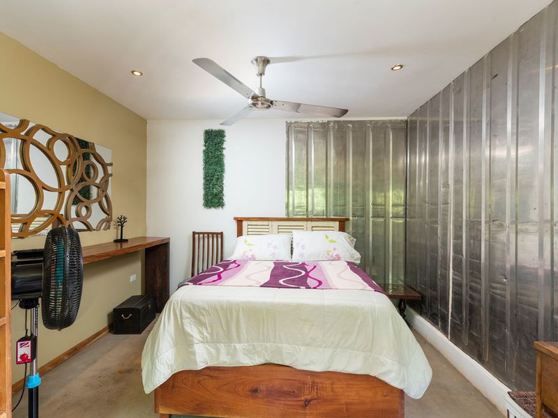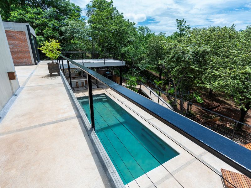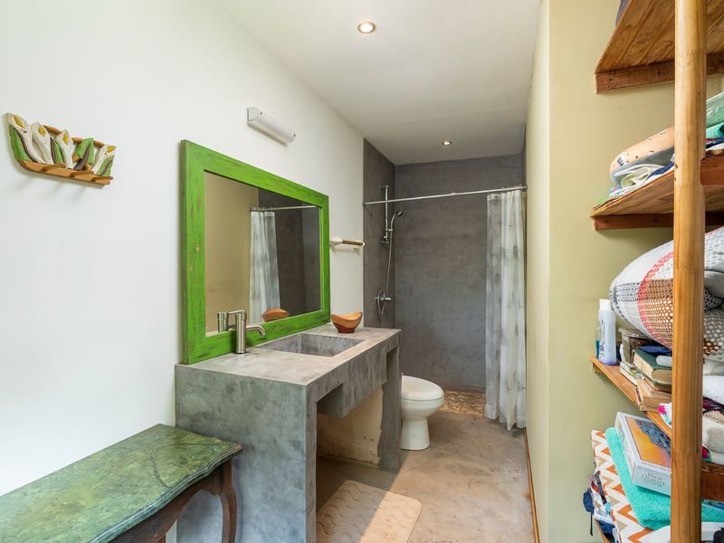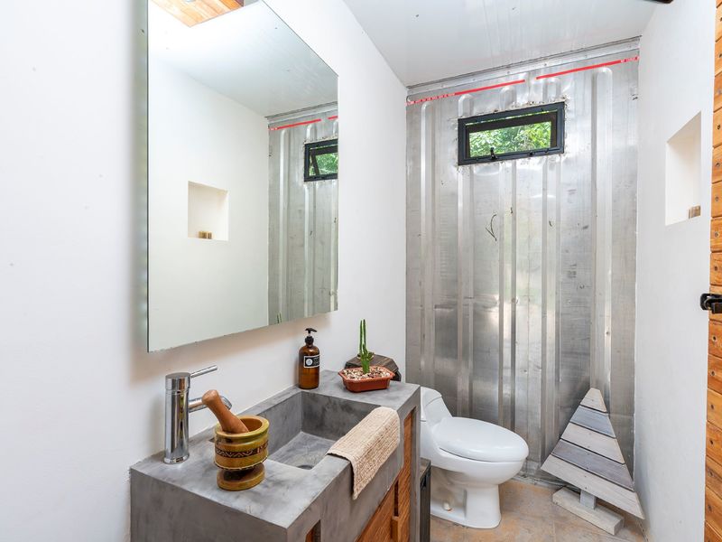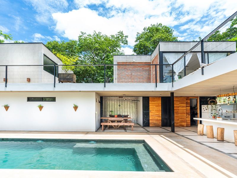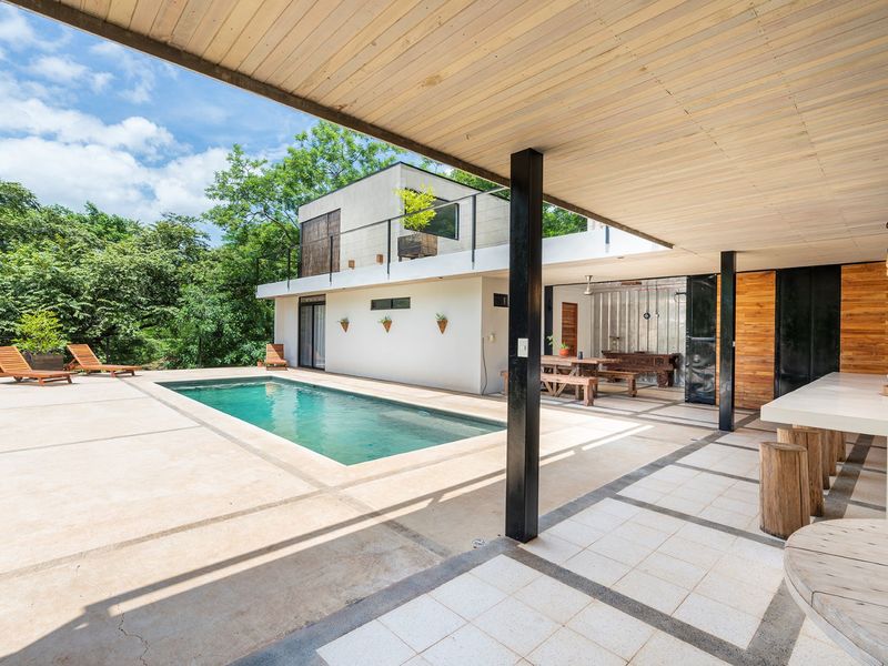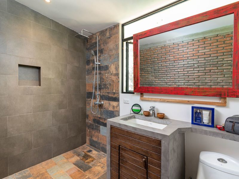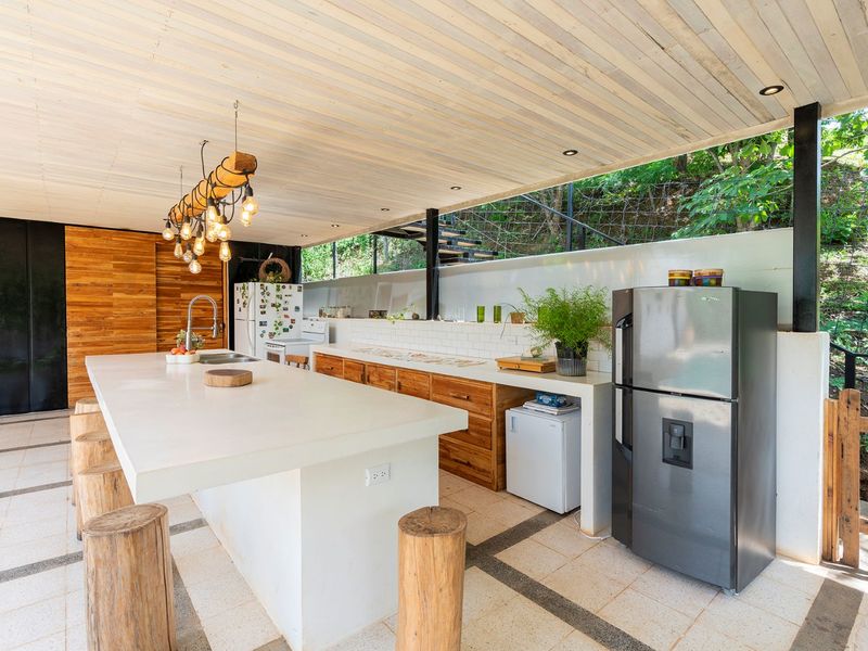 The third level is where you will find the 3rd bedroom and extra terrace space and home office. This room also has an ensuite bathroom, floor to ceiling sliding doors and a queen bed. There is ample room on the terrace to create another office or bedroom, or perhaps to be utilized as a yoga deck/gym area. The home office is ample in size with a wonderful view into the green jungle close by on the property. This could be transformed to a 4th bedroom should any buyer wish so.