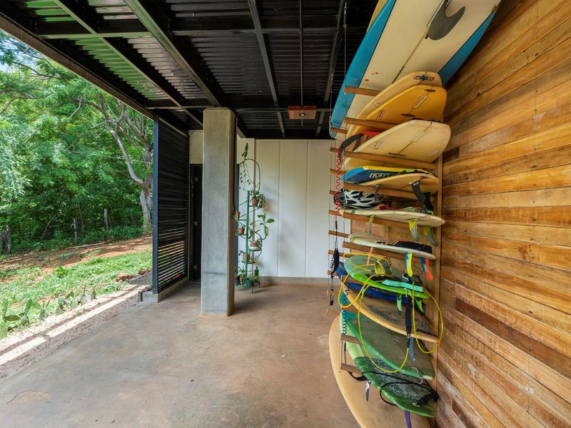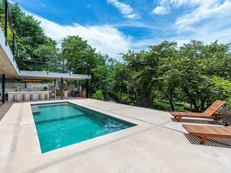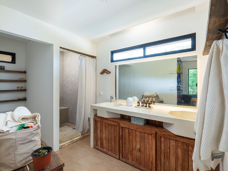 The second level is home to the 20m2 pool, the spacious, durable and well equipped kitchen, living and BBQ area. There is seating for 6 at the outdoor dinging table as well as for 4 at the extended breakfast bar/kitchen island. There is hardwood storage ofr the kitchen and modern looking subway tiles setting off the kitchen area. This is part of the whopping 2300+ft2 of terrace space. There is a pool bath on this floor also. The master suite is located on this floor with floor to ceiling sliding doors giving access to the pool and lots of natural light. The ensuite is a great mix of beach modern design with white wash walls and use of tropical hardwood throughout.