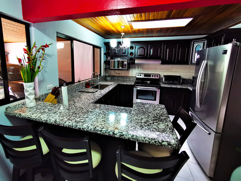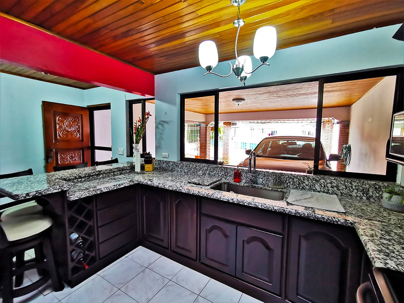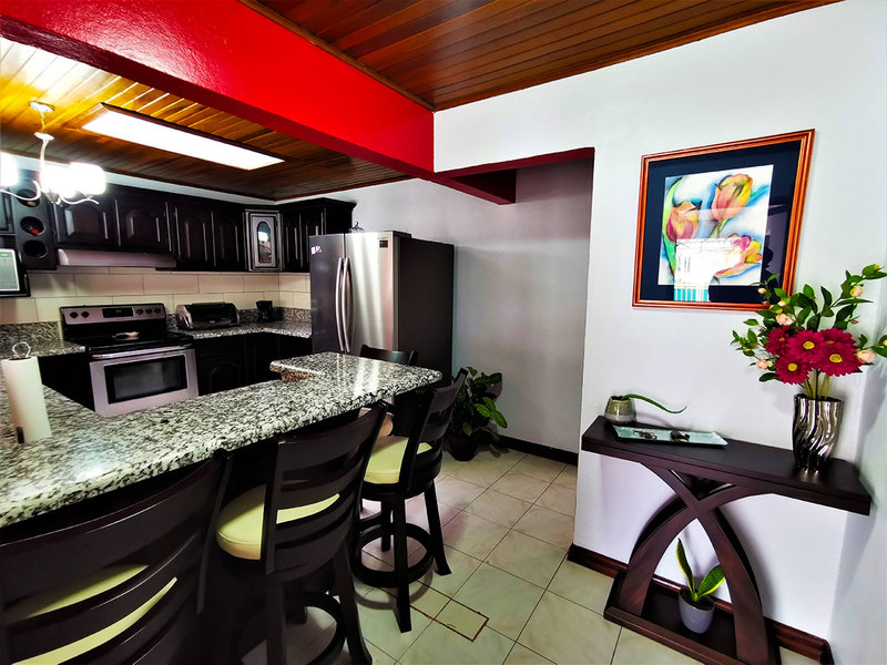 The covered parking has enough space for two cars and is also connected to the typical Tico style front porch to spend time. A large laundry room with some additional storage room is located next to the social area.