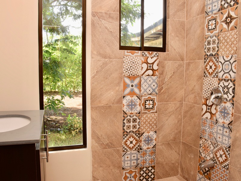 The 2 guest bedrooms are located either side of the guest bathroom. Both have floor to ceiling sliding French doors leading to the pool and built in wardrobes. The bathroom is adequately sized and has some colorful tiles in the shower giving it a modern look.