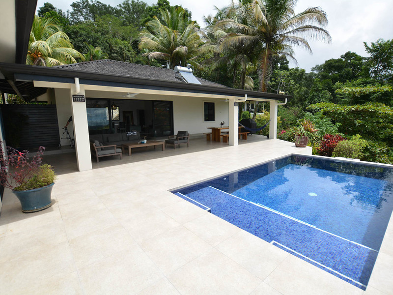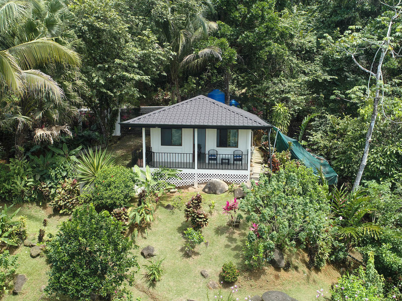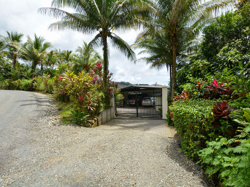This immaculate property offers unobstructed, stunning mountain and ocean views, sunsets, privacy, saltwater pool, and over 2 acres of stunning landscaped mature gardens. Enjoy a walk through the terraced pathways lined with mature fruit such as mango, banana, citrus, guanabana, avocado, papaya, pineapples, and much more. The fenced property borders a creek and truly connects with nature with an abundance of wildlife.
