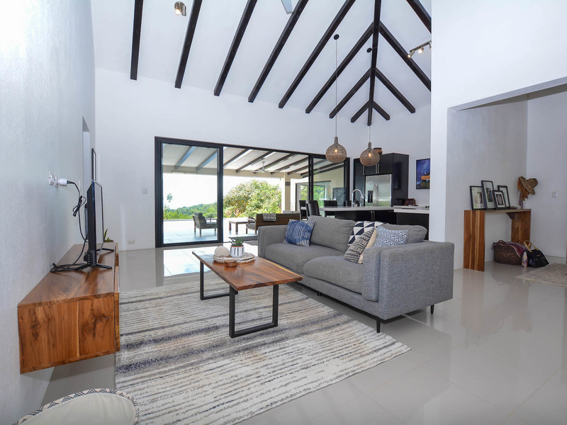 The open floor plan of the kitchen and the living room includes vaulted ceilings and high-quality finishings. The living and kitchen area leads out through the sliding glass doors to a huge covered patio with a stunning custom dining table, bbq, and lounge area with a large sectional sofa overlooking the saltwater pool. Perfect spot to entertain and take in the views.