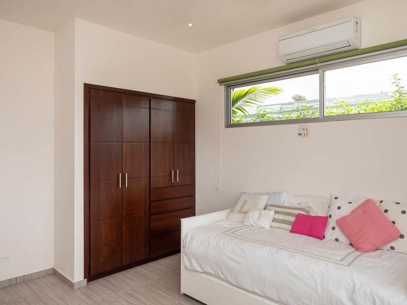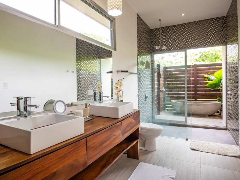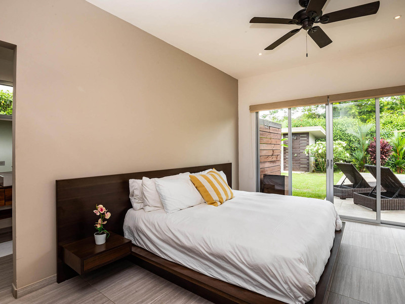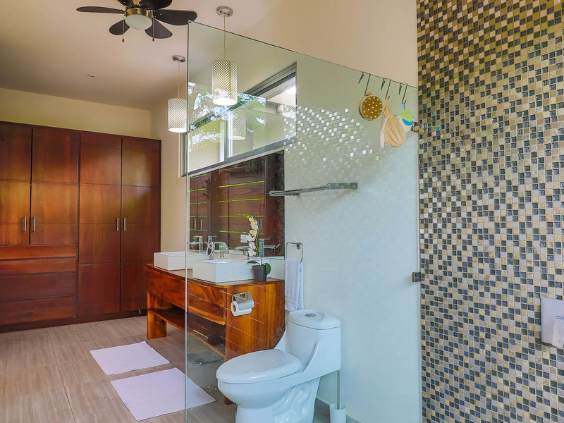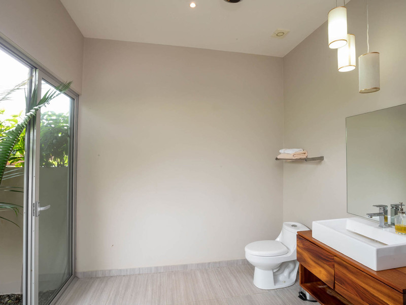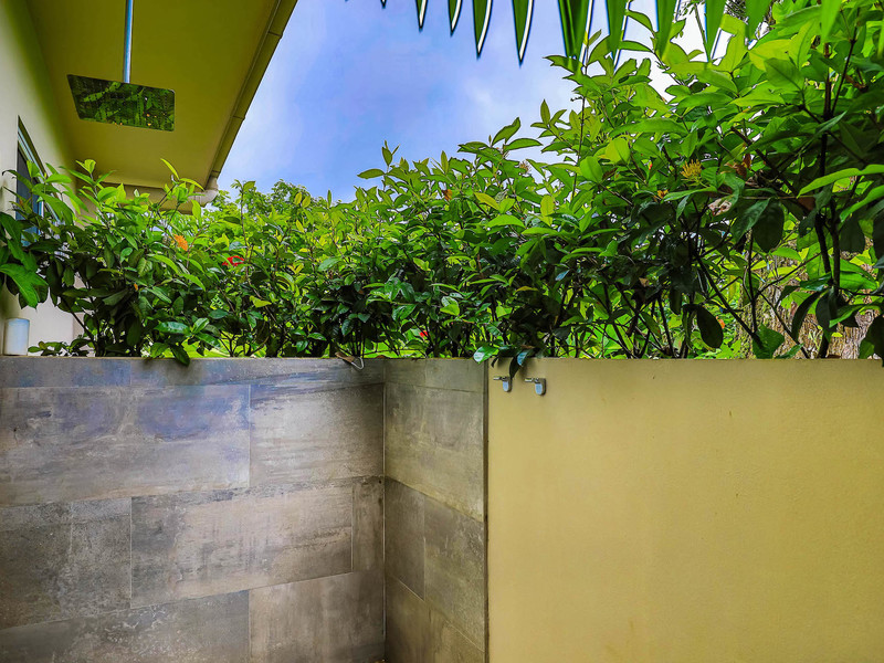 The master suite is located on the left side of the house; the guest bedrooms and guest bathroom on the right. The master bedroom is spacious with a king-sized bed, air conditioning, ample room for clothes and shoes. The master bathroom is bright and stylish. It offers his-and-her sinks, warm hardwood trim, and gorgeous tile adorning the shower. The guest bedrooms are separated by the guest bathroom with its verdant outdoor shower. Both bedrooms have a/c and large closets, and the backroom leads out to the pool patio.