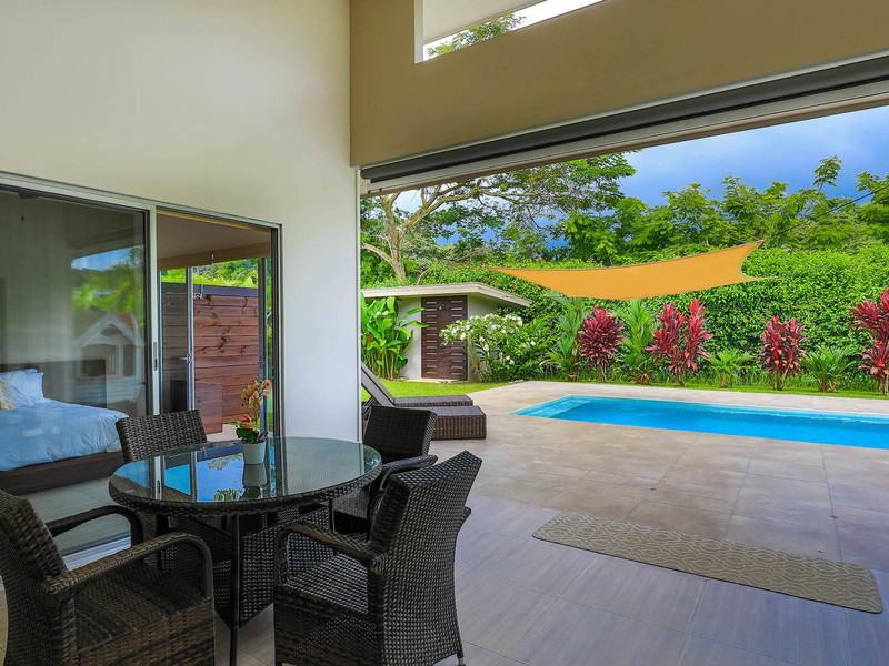 Mature landscaping and grass wrap the 20’x10’ swimming pool in the backyard. If you want shade, the patio offers it. If you want to lounge in the sun, the concrete pool deck offers it. There is even a peek of the mountains standing above Uvita.