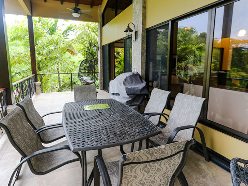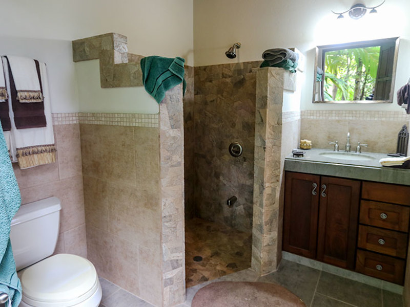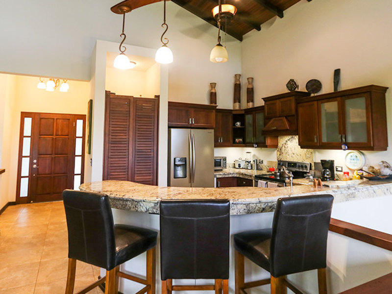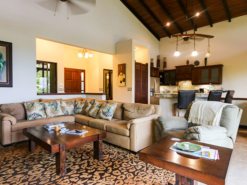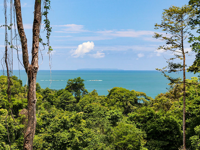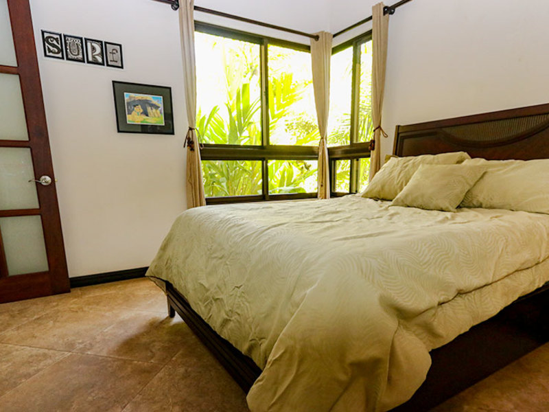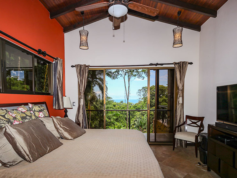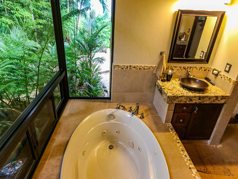 The main level includes two bedroom suites on opposite sides, separated by a kitchen with walk-in pantry and a spacious living room that opens up to a large covered balcony. The ocean view master suite includes a balcony, a walk-in closet, and a luxurious bathroom with a jacuzzi tub. The second upstairs bedroom features an elevated rainforest view, a large closet, and a private bathroom. Whether you are in the master bedroom, cooking in the kitchen, or lounging on the balconies, you will enjoy a wonderful ocean view highlighted by waves breaking off the Ballena Rocks and Cano Island off in the distance.