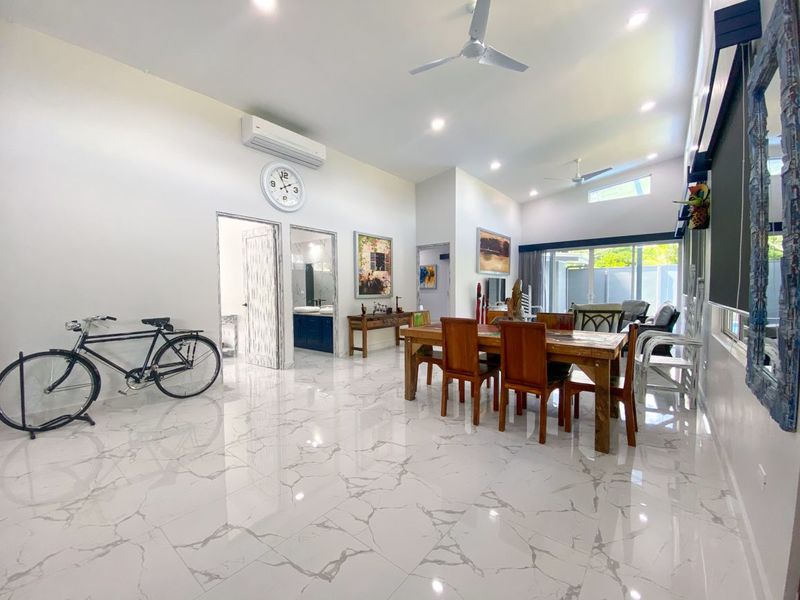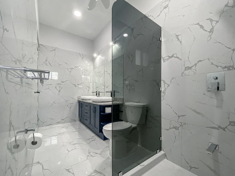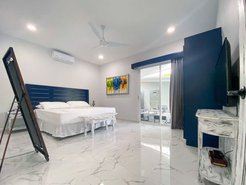 The entry doors to the bedrooms and the bathrooms are both unique and intriguing. The white washed finish blends nicely into the ambiance of the home, and behind the doors await a relaxing and spa-like space for you and your guests to relax and unwind. The master bedroom is an unbelievable delight, with a very large, bright, and appealing master bathroom. The large master bedroom also opens up to the gorgeous outdoor living spaces and that alluring pool.