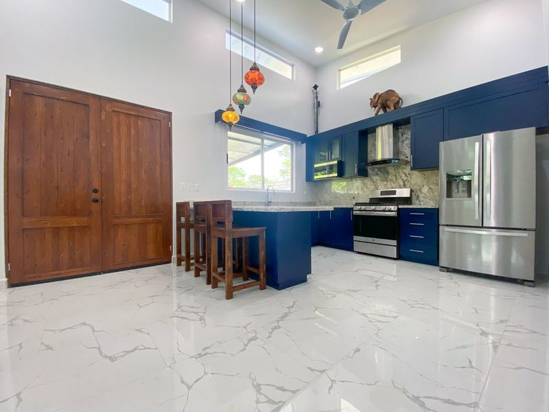 The large wooden entry door is a wonderful and splendid ingress to this amazing home. As it opens up, you will be mesmerized by the natural light flooding in through the many windows, and the polished floors contrasting against the custom made kitchen cabinets.