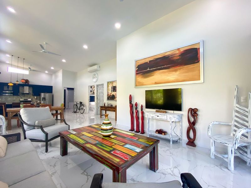 The dining area includes a artful dining table, which will be the talking point for many dinners with friends and family. From the dining area, the open concept home progresses to a very large living area. The furnishings were hand selected to enhance the beauty of the home, and to create a luxurious yet 'beachy' feeling to this amazing home.